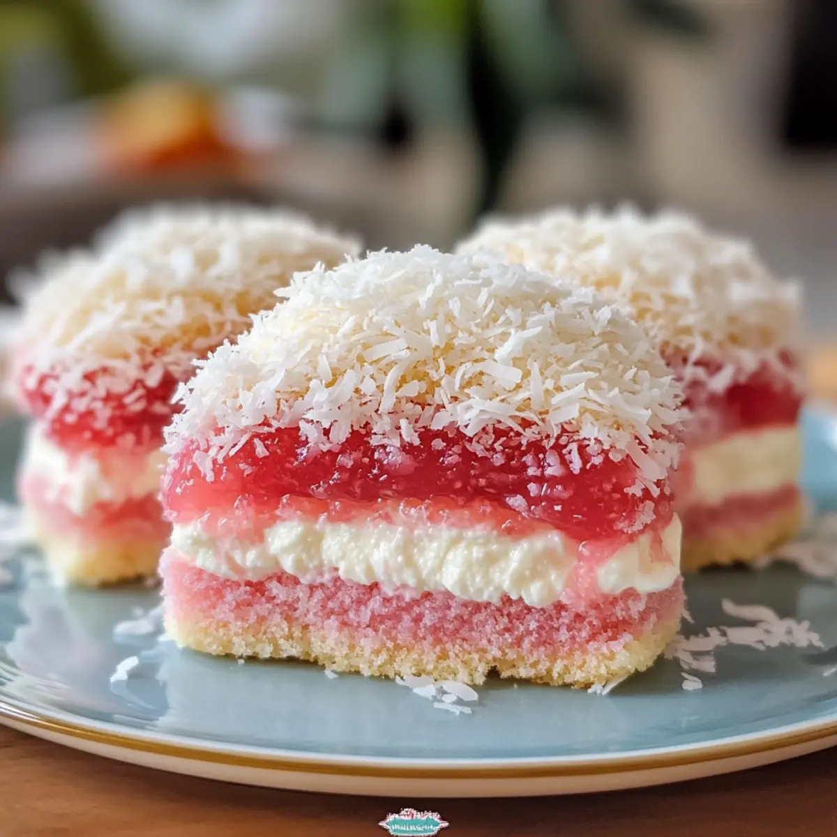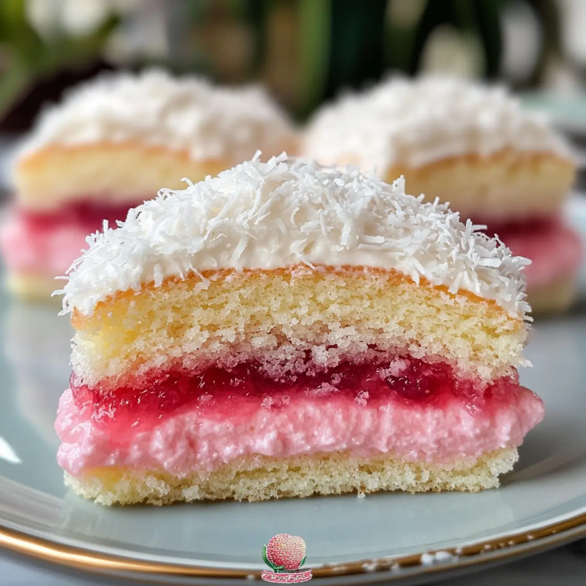 - Tauche die abgekühlten Küchlein in das Erdbeer-Gelee, bis sie gleichmäßig bedeckt sind. Lass das überschüssige Gelee abtropfen und rolle die Küchlein in den Kokosraspeln.