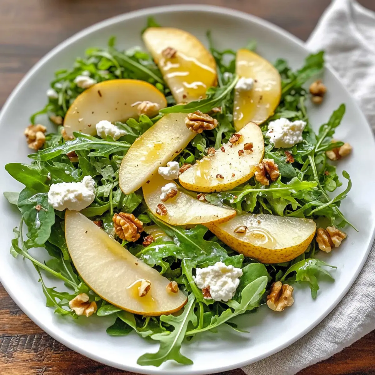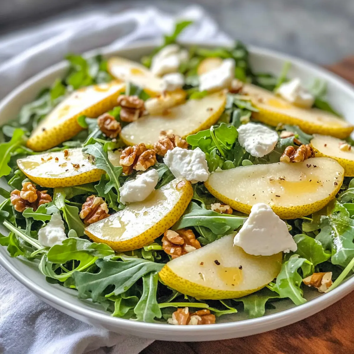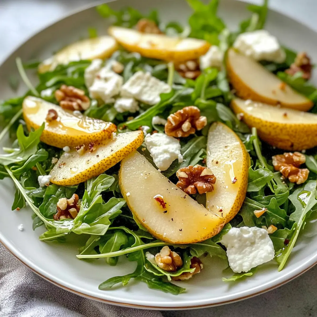 Frische Aromen: Der Birnen- und Rucola-Salat kombiniert knackige Birnen und pikanten Rucola, was für ein unvergessliches Geschmackserlebnis sorgt.