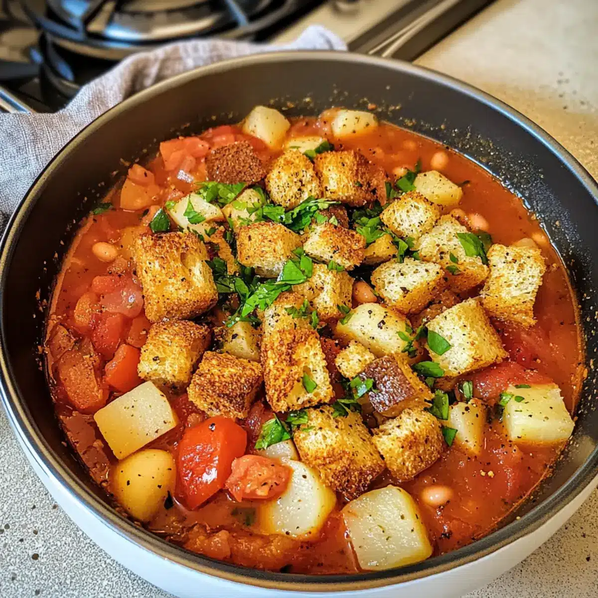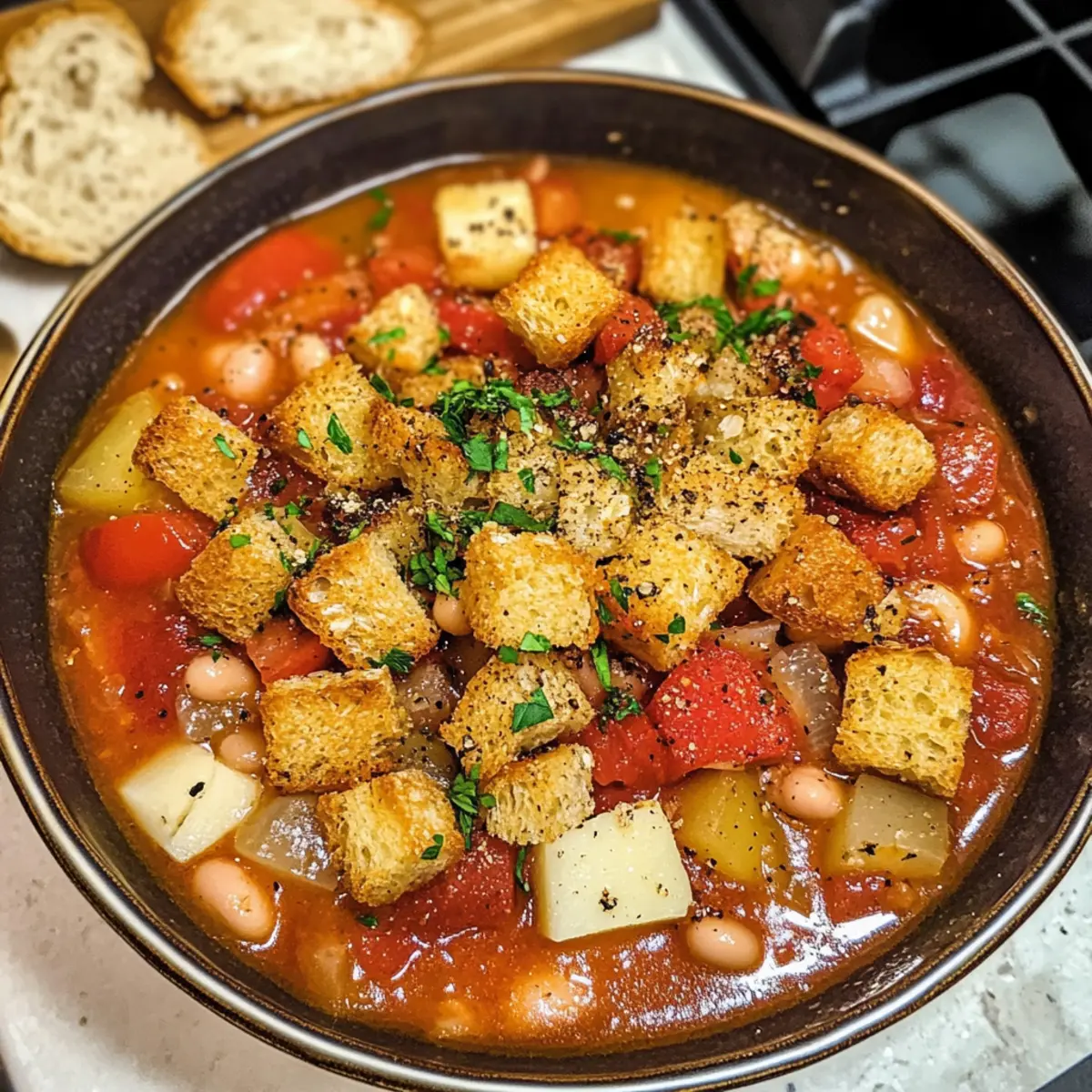 Bohnen- und Tomateneintopf mit Croutons für Soulfood