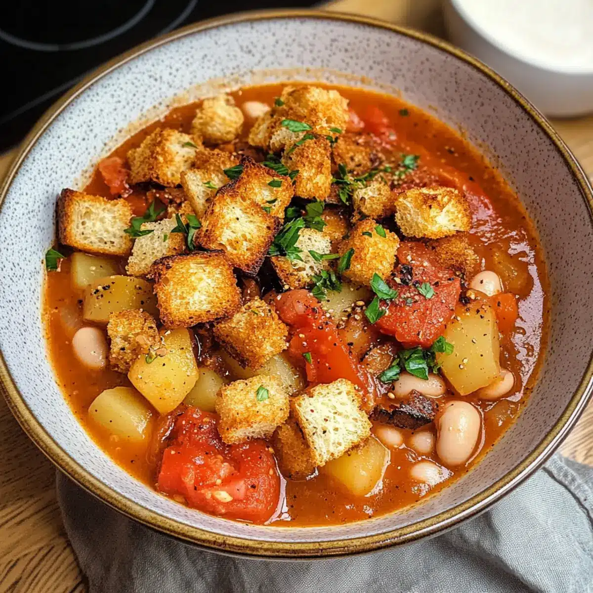 Es ist ein kalter Abend, und ich finde mich in meiner gemütlichen Küche wieder, umhüllt von verlockenden Aromen. Der Bohnen-Tomaten Eintopf mit Croutons ist mein Geheimrezept für solche Tage; nicht nur, dass er in kurzer Zeit zubereitet ist, sondern er bringt auch die Geschmacksexplosion von frischem Gemüse und aromatischen Gewürzen direkt in meine Schüssel. Diese vegane Speise ist ein wahrer Genuss – sie vereint die Herzlichkeit eines Eintopfs mit dem knusprigen Crunch der selbstgemachten Croutons, die das ganze Gericht abrunden. Steuerst du auf ein schnelleres Abendessen zu, das die ganze Familie liebt und dazu noch glutenfrei ist? Hier erfährst du, wie du dieses herzhafte Wohlfühlessen zaubern kannst!