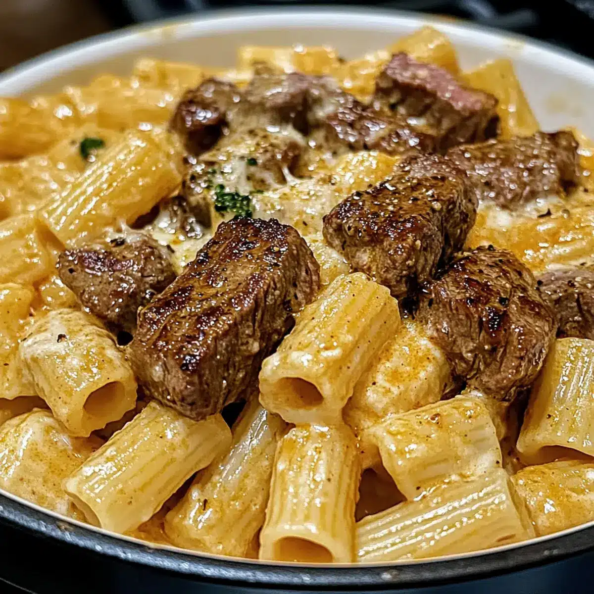 Käse Rigatoni Parmesan Soße mit Cajun Steak Tipps