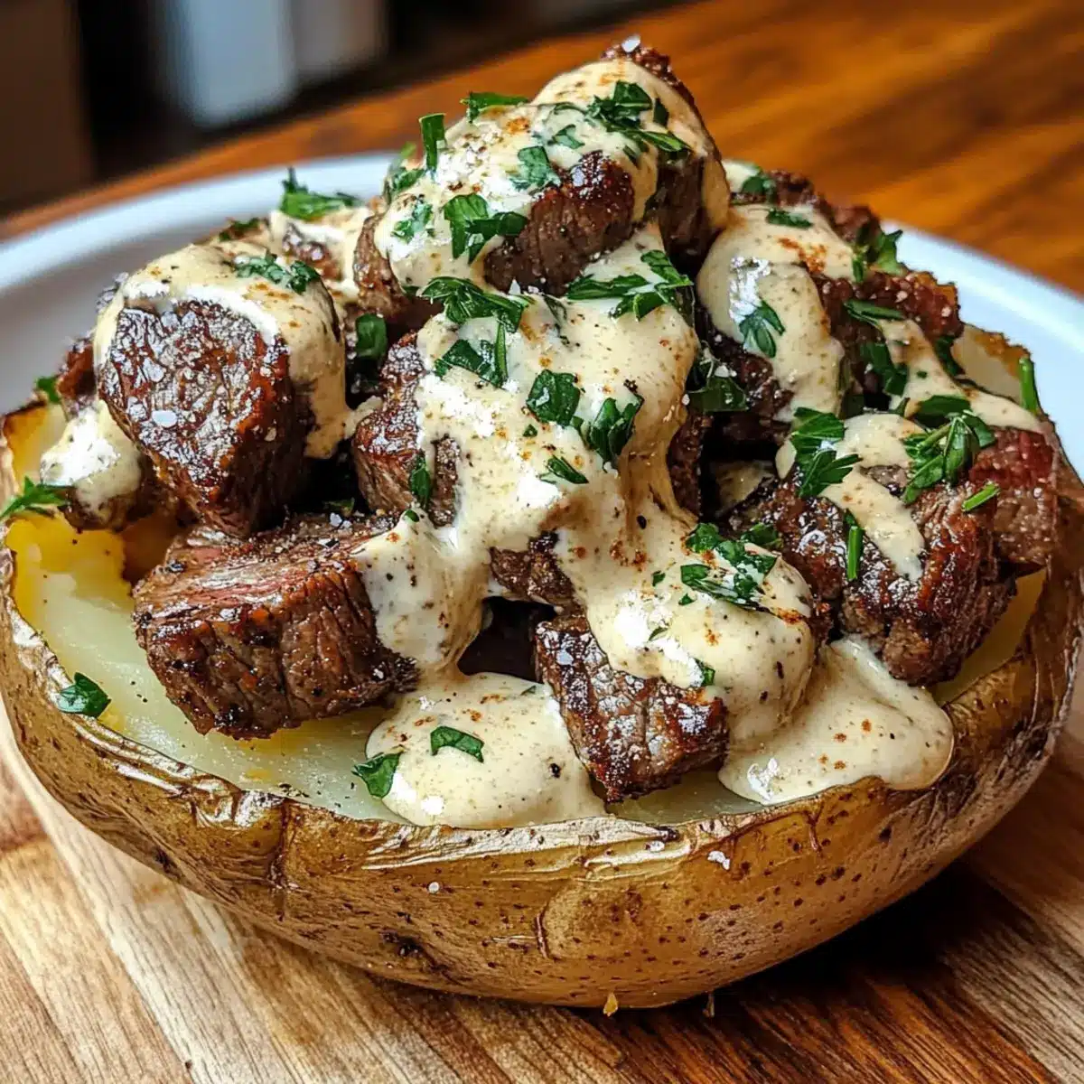 Beladene Steak-Kartoffel mit cremiger Sauce