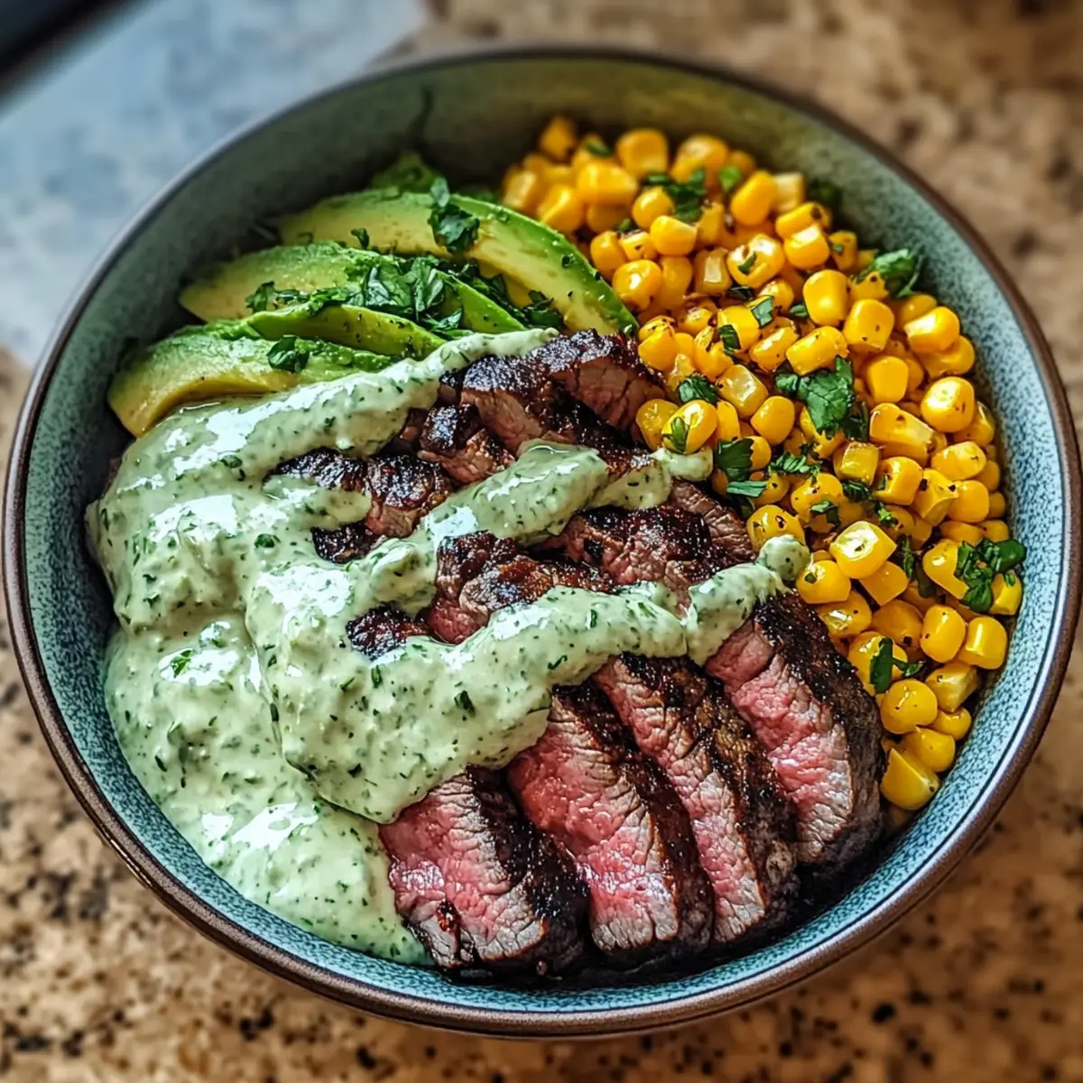 Steak, Avocado und geröstete Mais-Bowl erleben