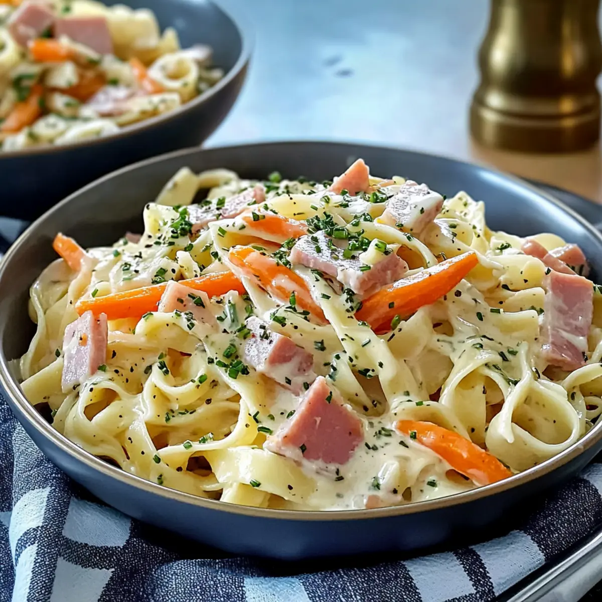 Karotten- und Schinkenpasta in Schnittlauchsoße