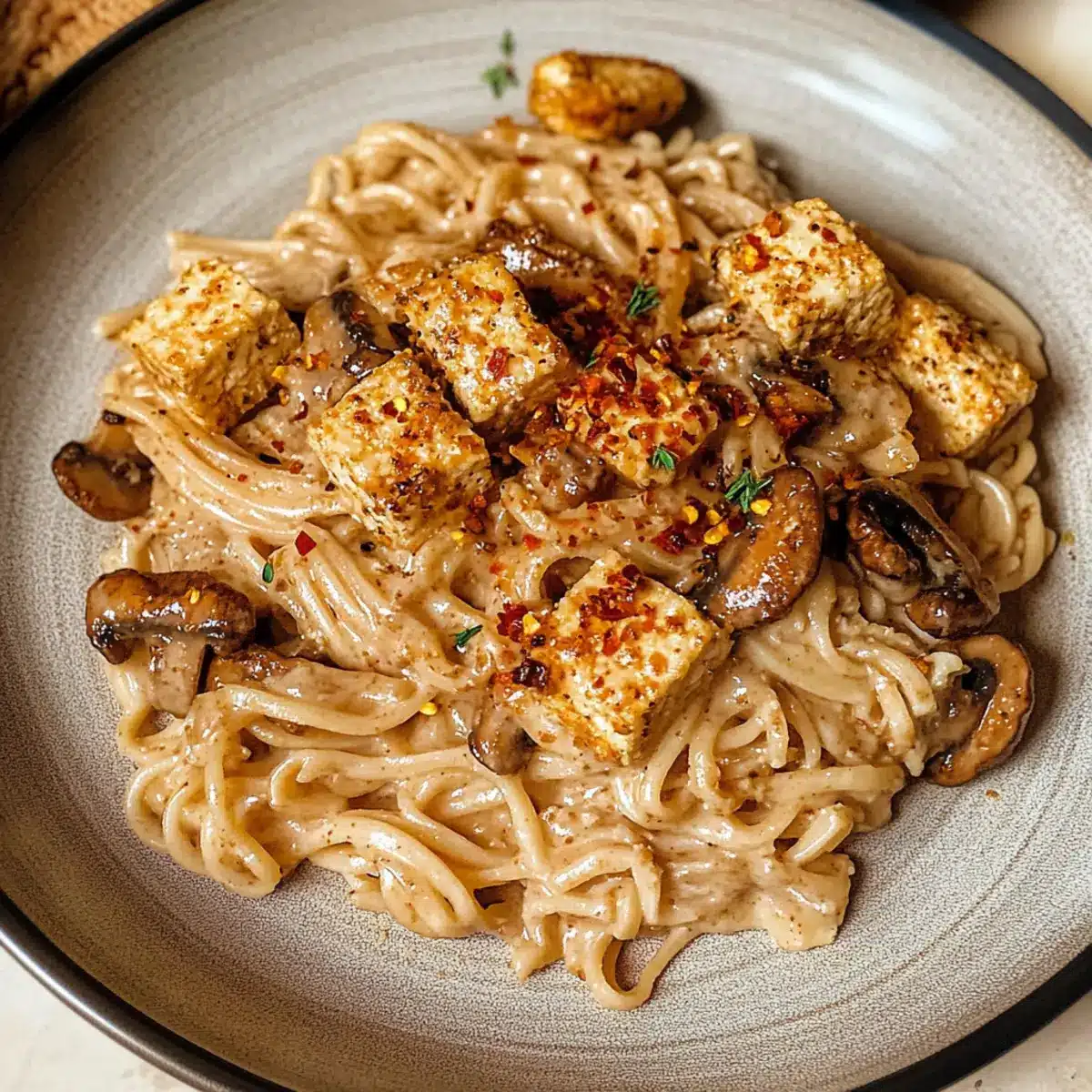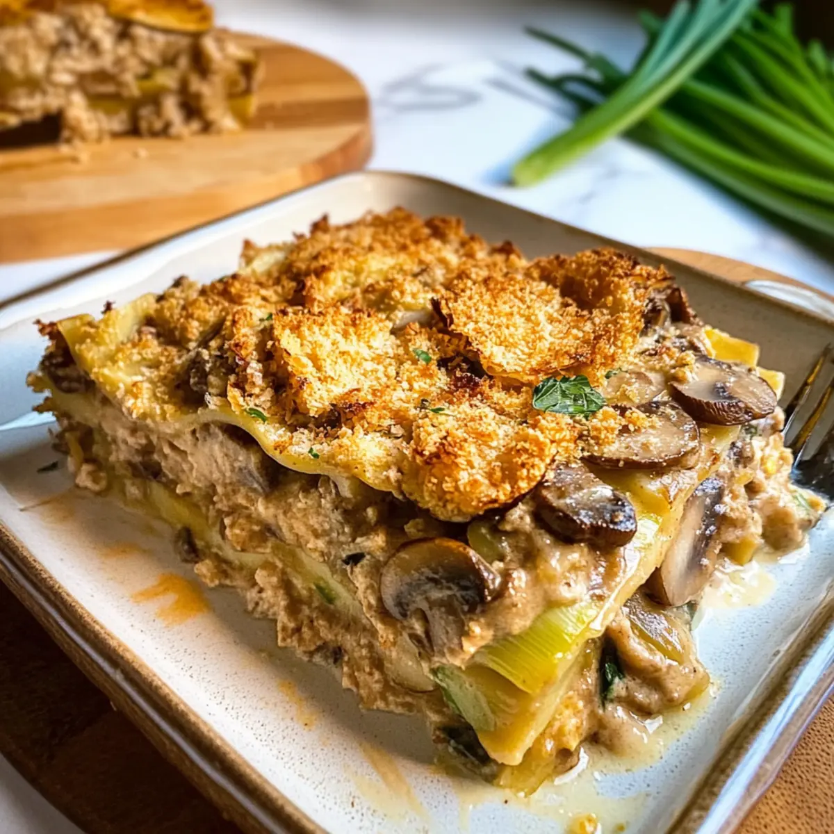 Pilzlasagne mit Lauch und knusprigem Tofu-Topping