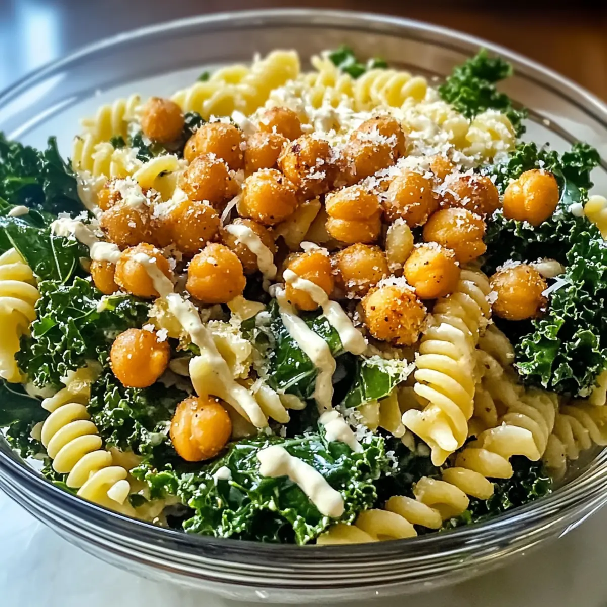 Kale Caesar Pasta Salat mit knusprigen Kichererbsen