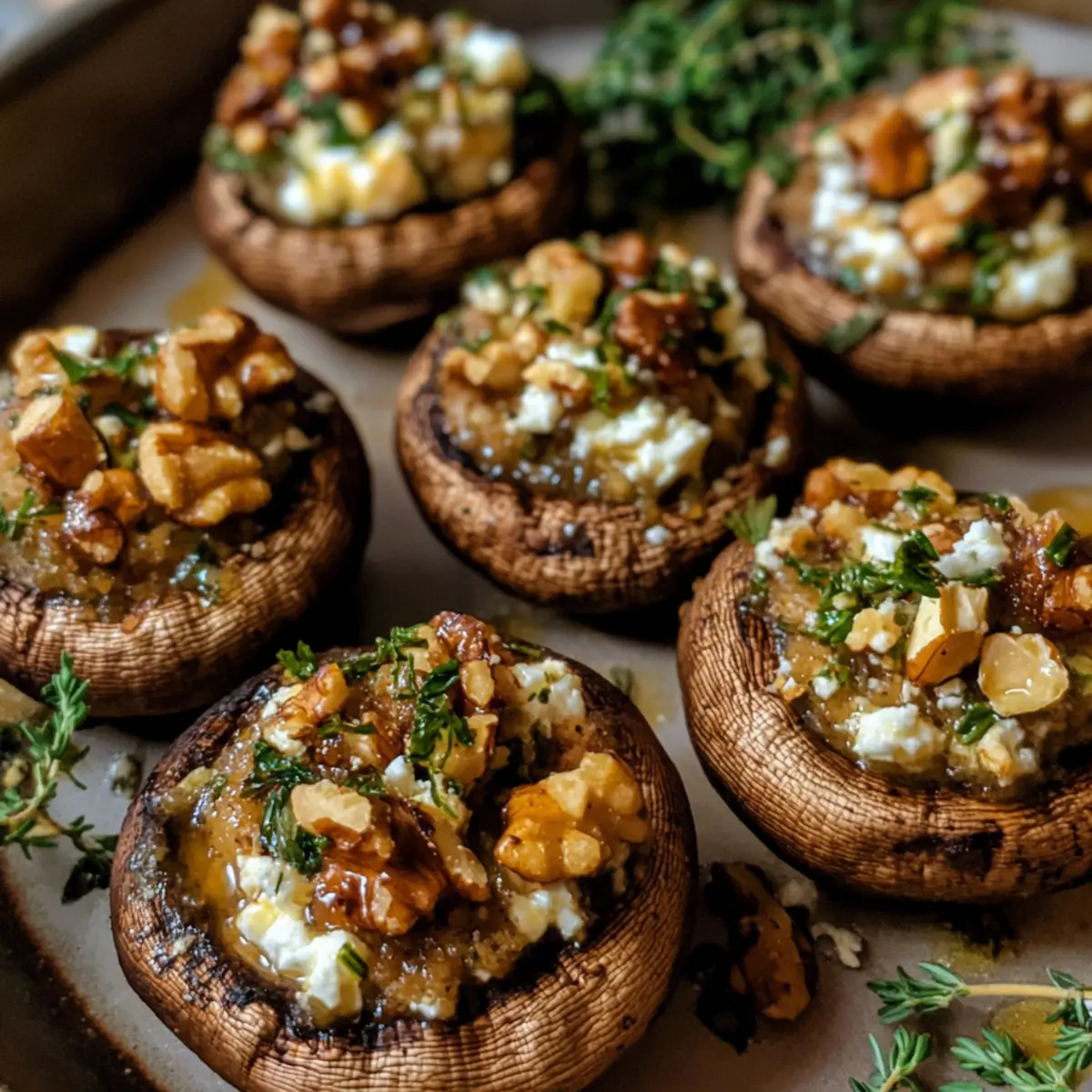 Nimm die gefüllten Champignons aus dem Ofen und lasse sie kurz abkühlen. Bestreue die warmen Champignons vor dem Servieren mit frisch gehackten Kräutern wie Thymian oder Petersilie. Diese Champignons mit Walnuss- und Feta-Füllung sind nun bereit, als köstlicher Appetizer oder Snack genossen zu werden!