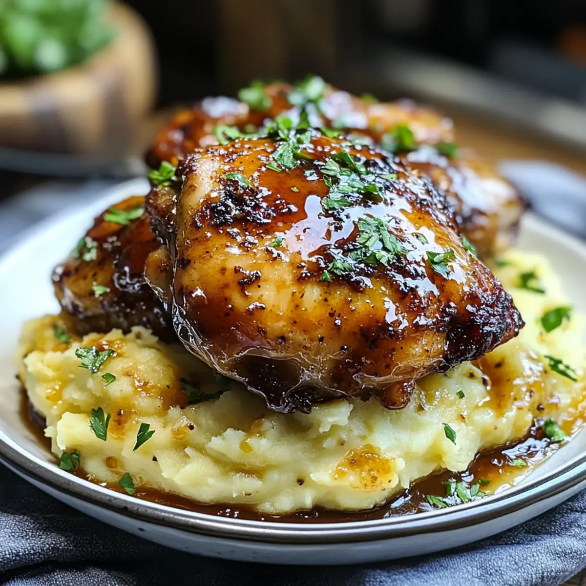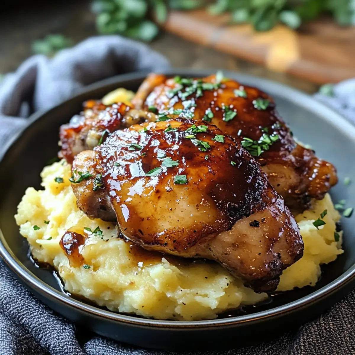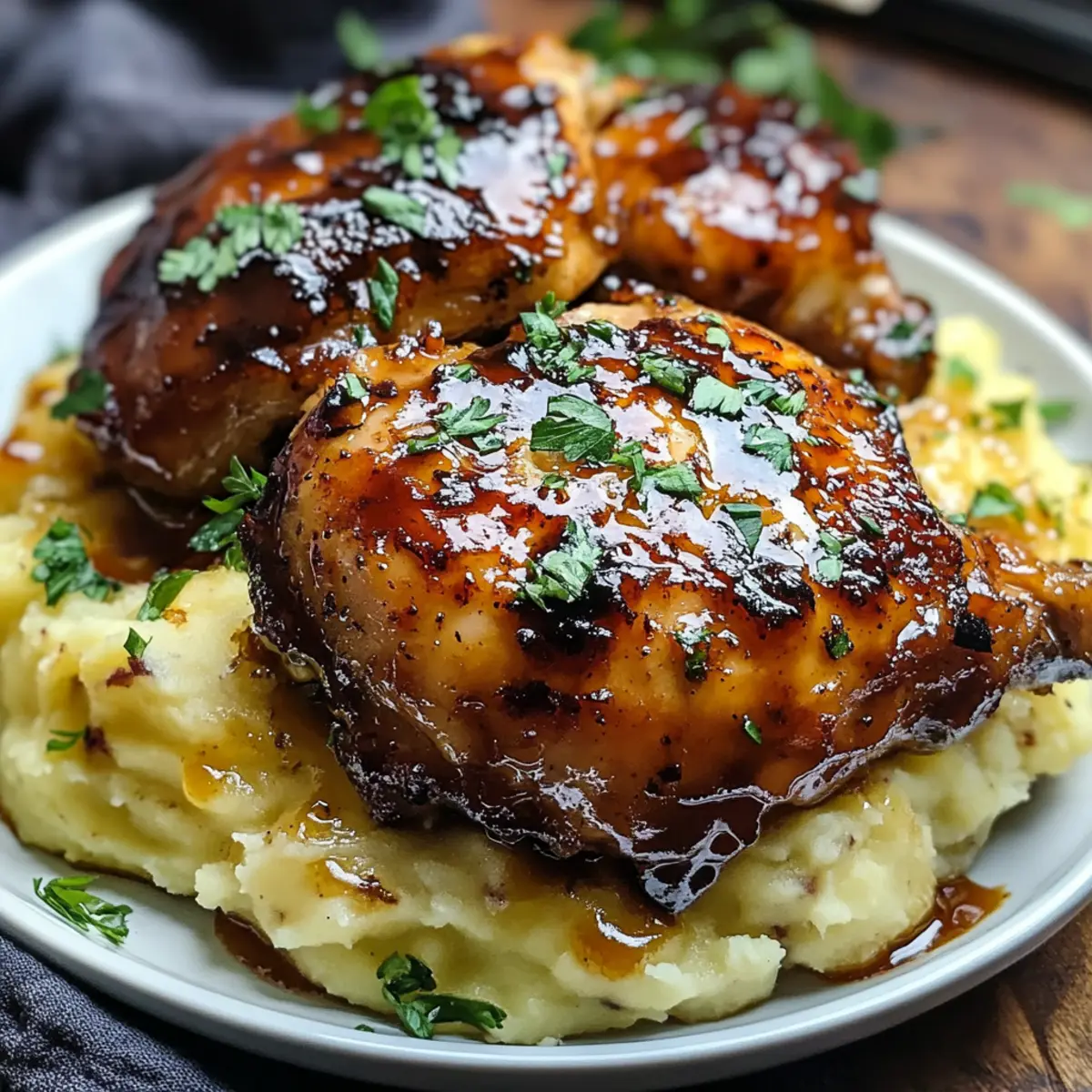 Die Chipotle-Honig-Hühnchenbeine zusammen mit dem cremigen Gouda-Püree anrichten. Die Bratensäfte aus der Auflaufform über das Hühnchen träufeln und nach Belieben mit frischen Kräutern garnieren. Genießen Sie diese gemütliche, herzhafte Mahlzeit!
