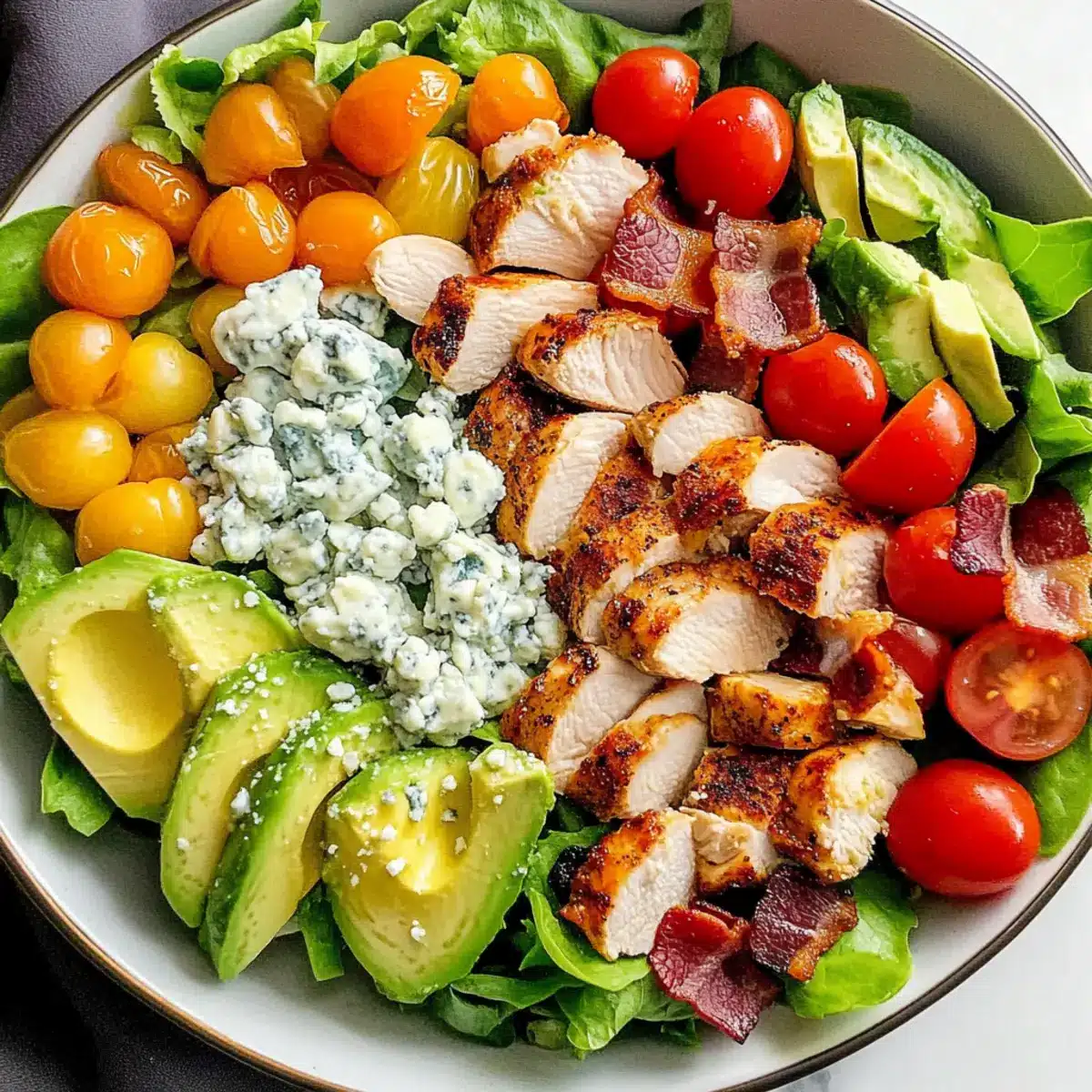 Einzigartig und anpassbar: Dieser frische Cobb-Salat bietet unendliche Möglichkeiten zur Individualisierung, ganz gleich, ob Sie ihn mit frischem Gemüse oder zusätzlichen Proteinen anreichern möchten.