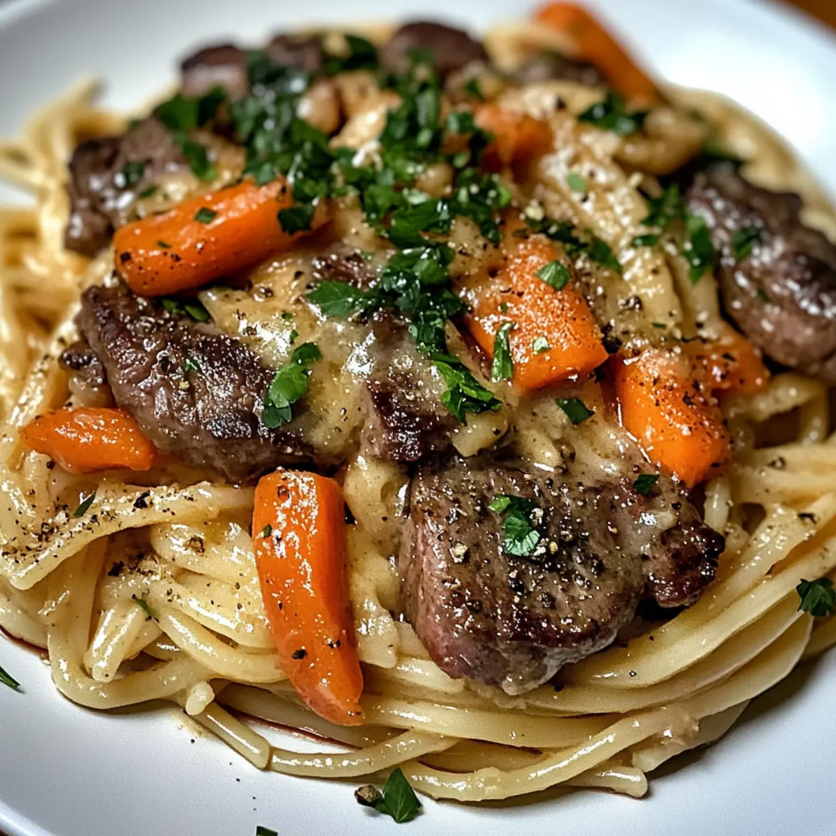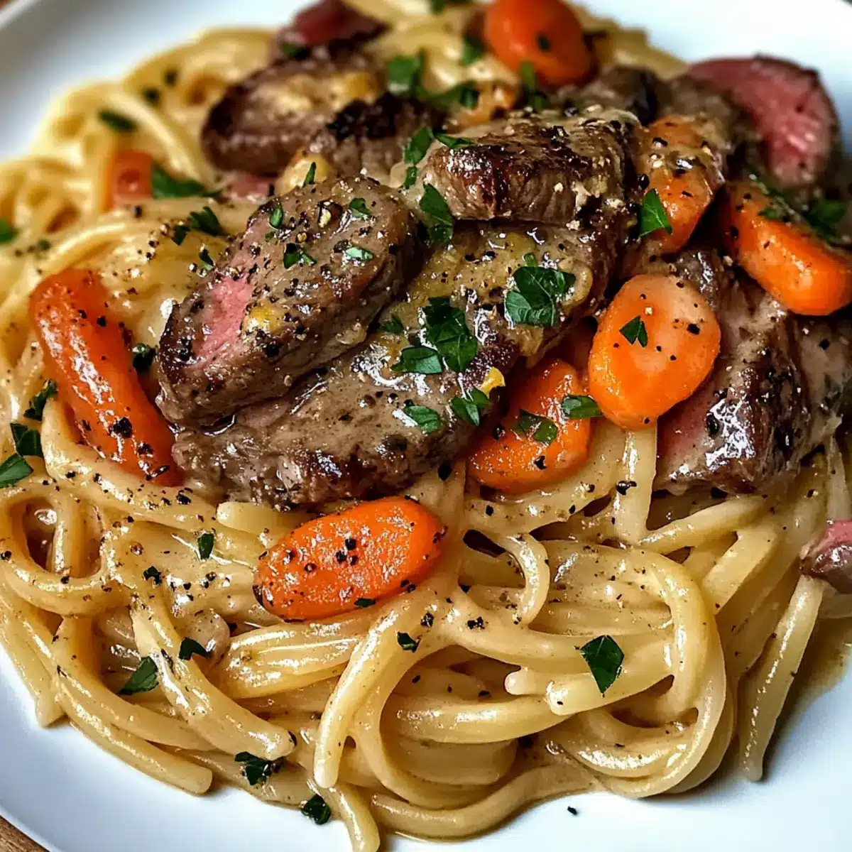 - Gekochte Linguine zur Sauce geben, gut vermischen, Steak und geröstete Karotten hinzufügen und vorsichtig vermengen.