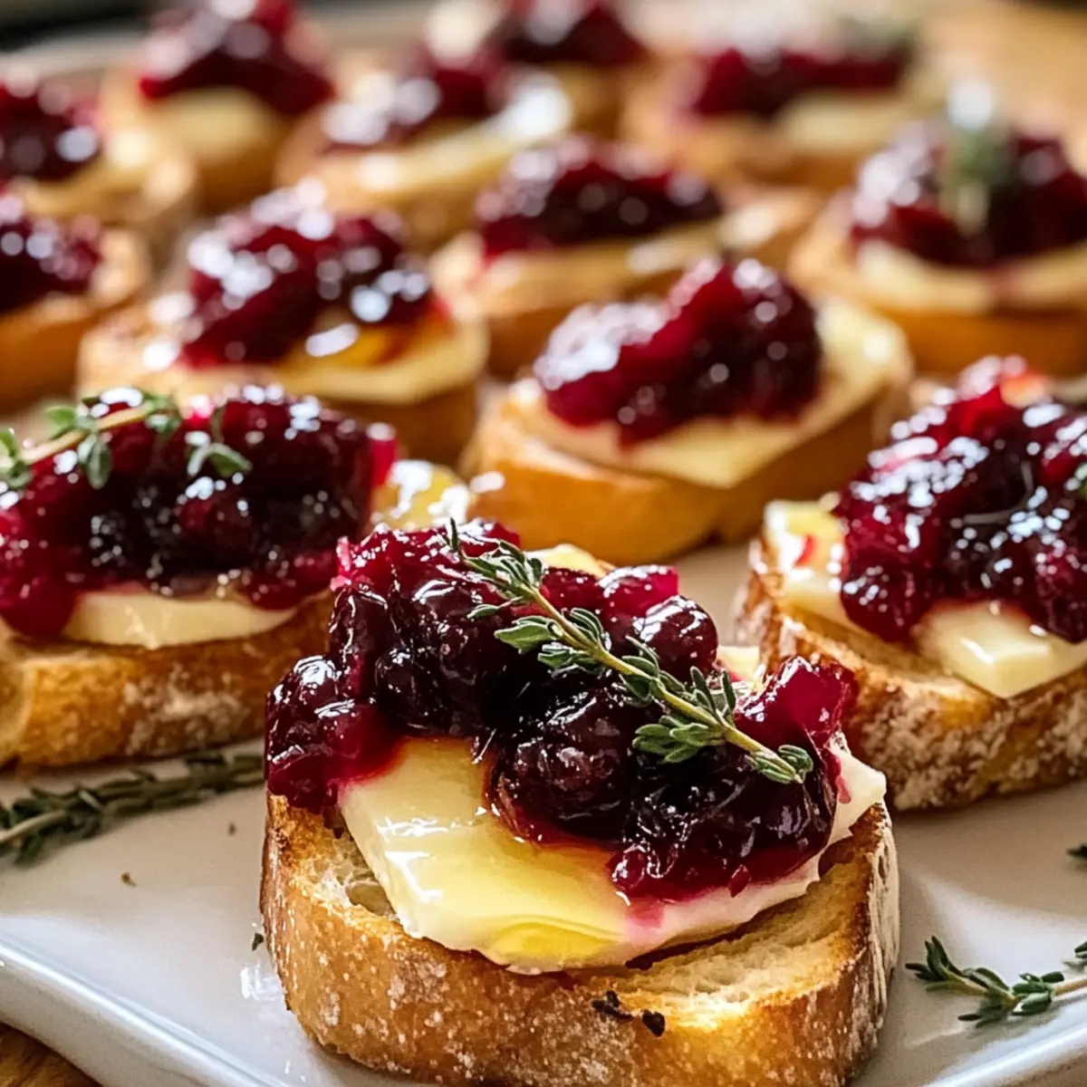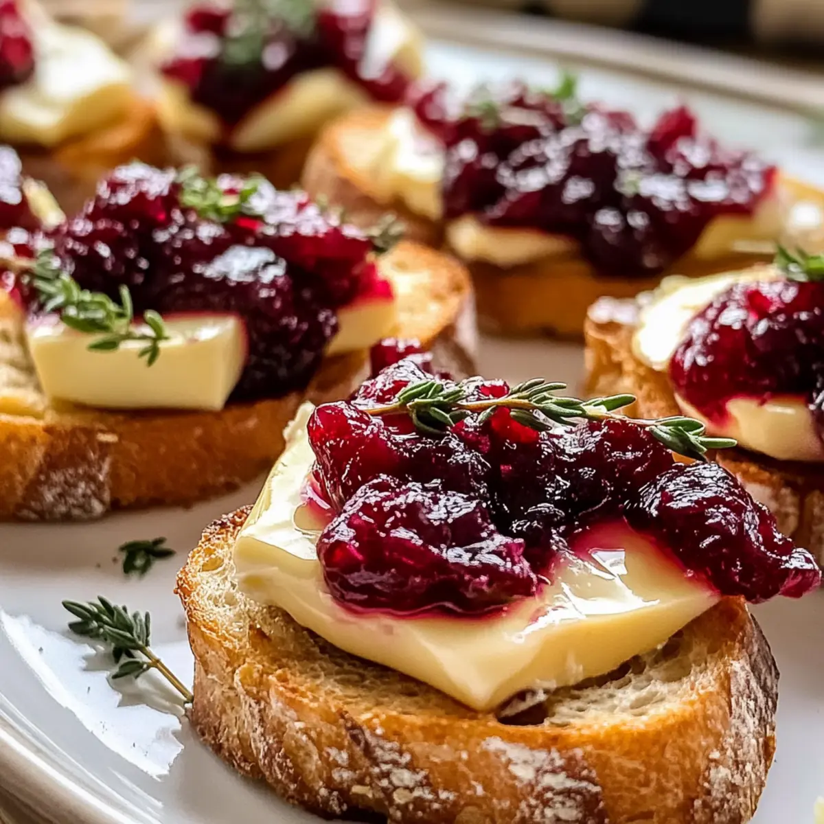 Nimm die Crostini aus dem Ofen und garniere sie mit frischem Thymian für eine hübsche Präsentation und zusätzlichen Geschmack. Optional kannst du einen leichten Honigdrizzle darübergeben, um den süßen Kontrast zu verstärken. Serviere die warmen Cranberry Brie Crostini umgehend, damit jeder Bissen frisch und köstlich bleibt.