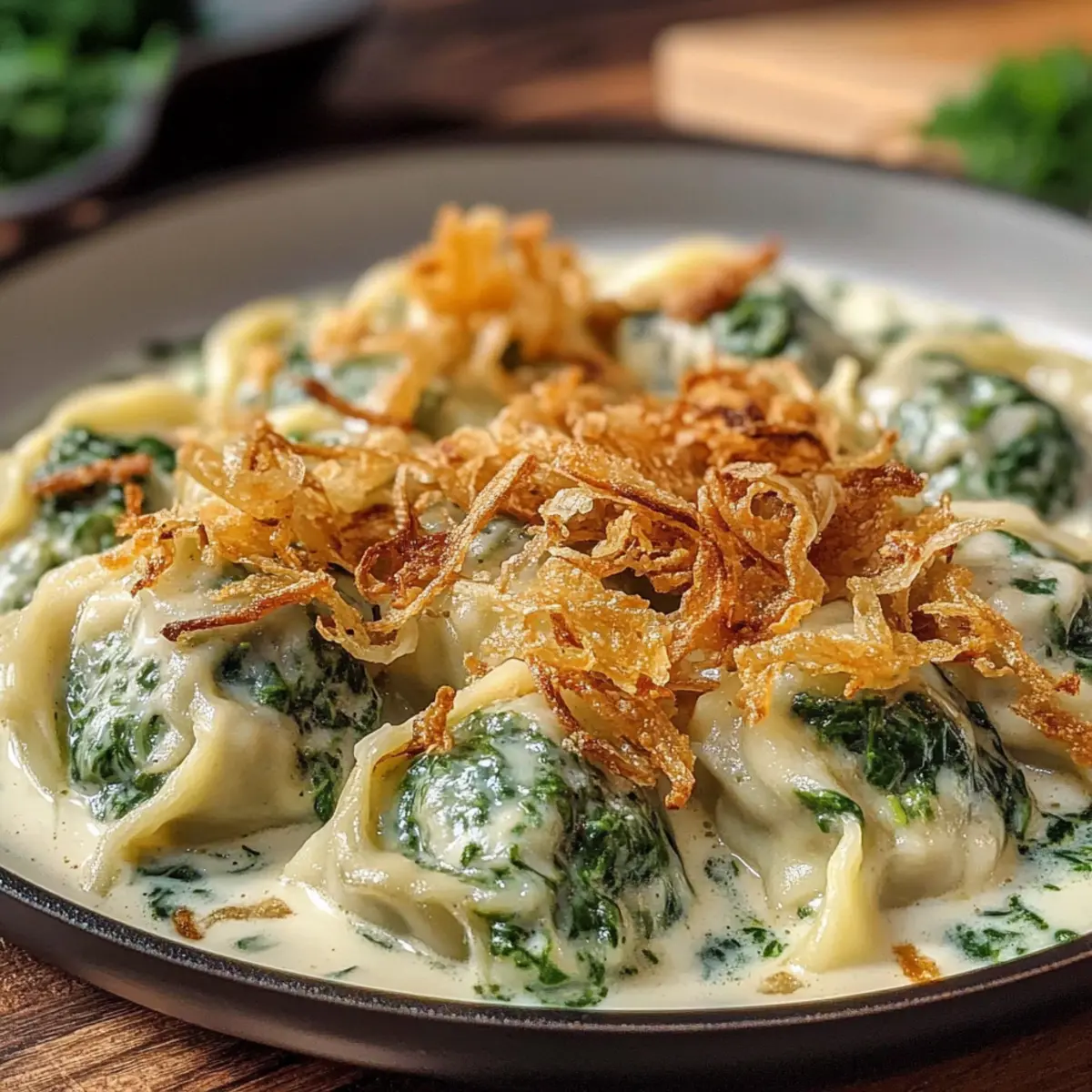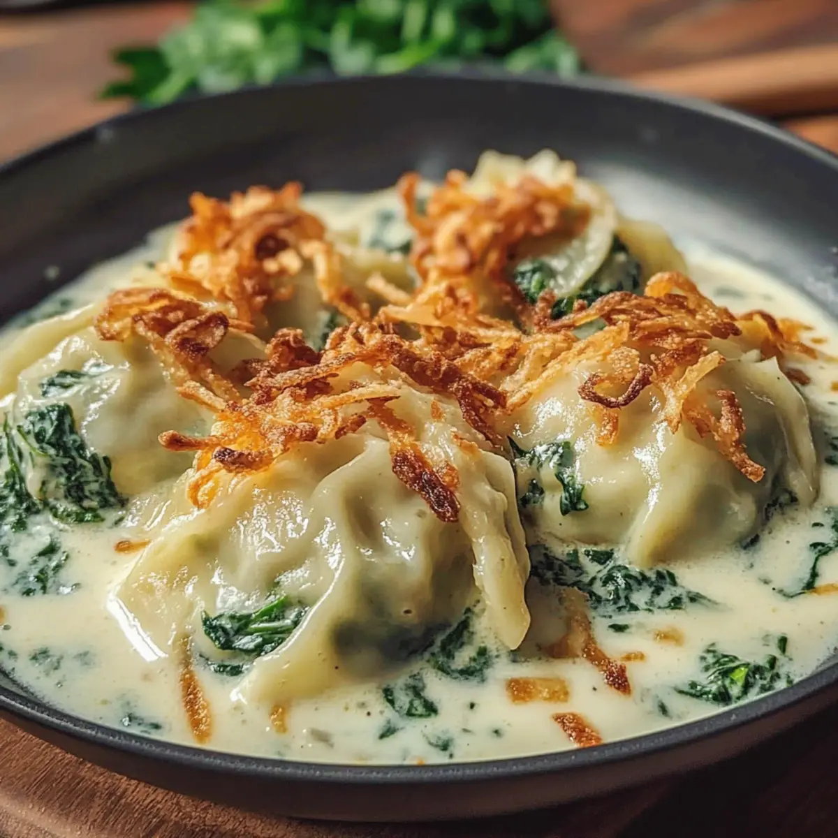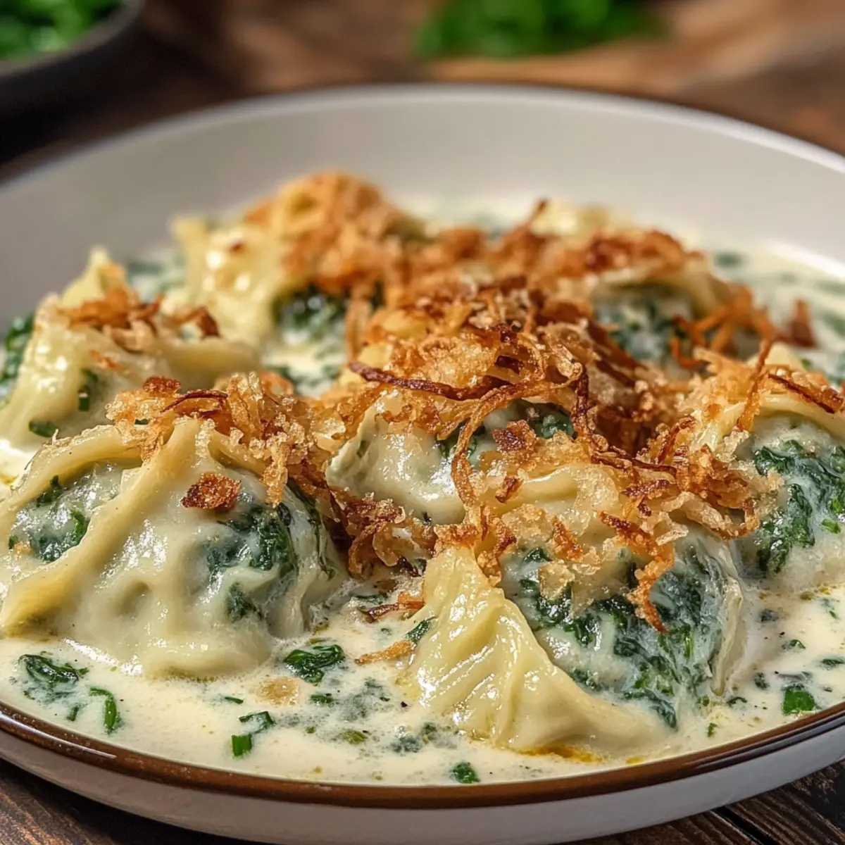 Anrichten mit Bedacht: Servieren Sie die Cremigen Spinat-Ravioli vorsichtig in der Sauce, damit die Füllung nicht austritt. Garnieren Sie mit den knusprigen Röstzwiebeln für den perfekten Crunch.