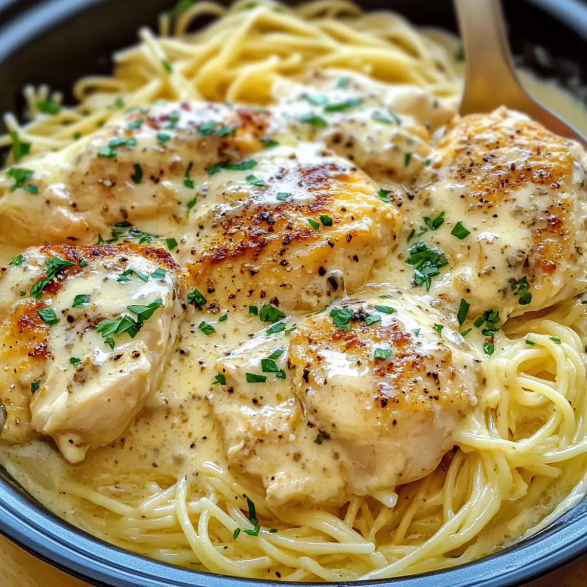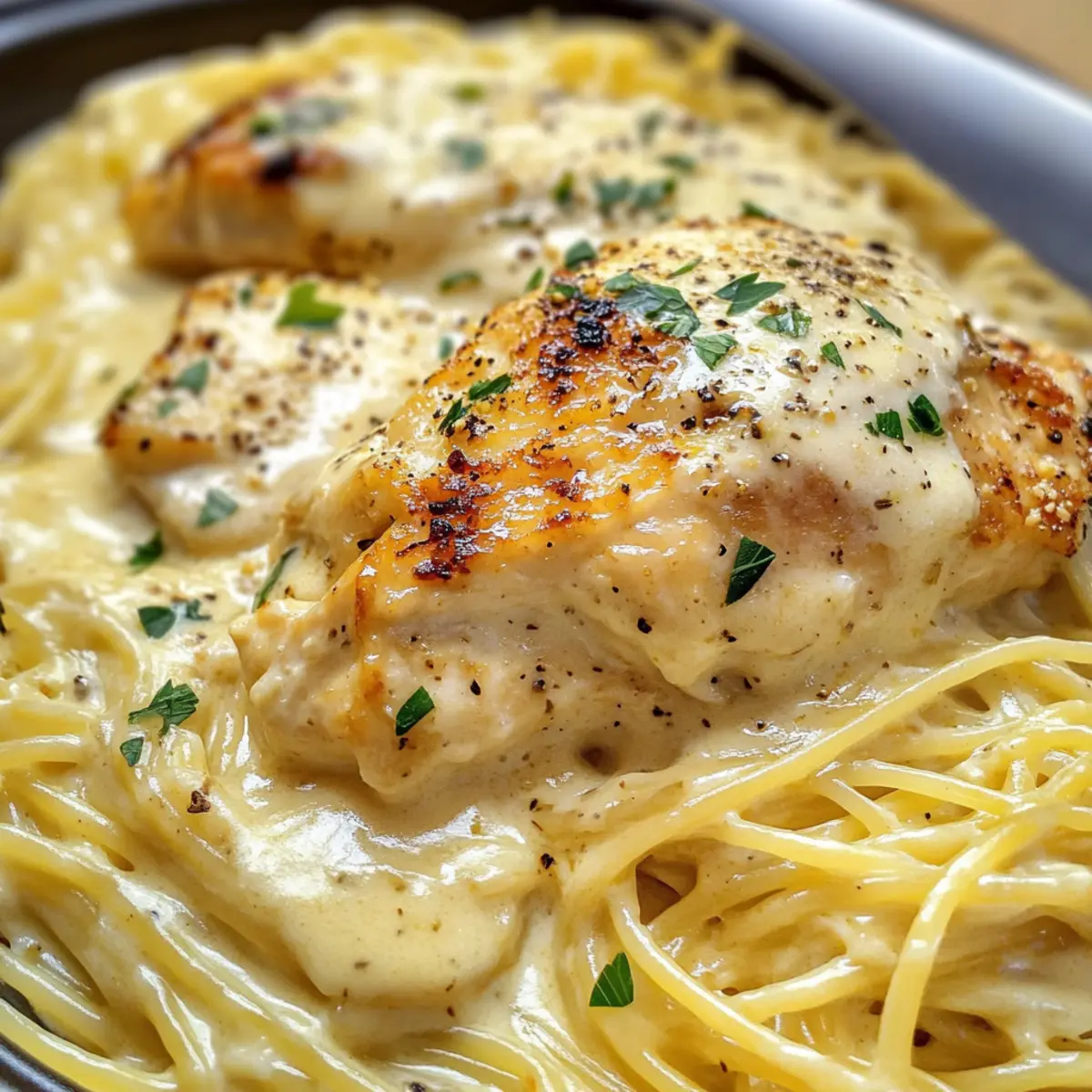 - Engelshaar-Pasta – dient als Basis für das Hähnchen und die Sauce; jede lange Pasta (wie Fettuccine oder Spaghetti) kann verwendet werden.
