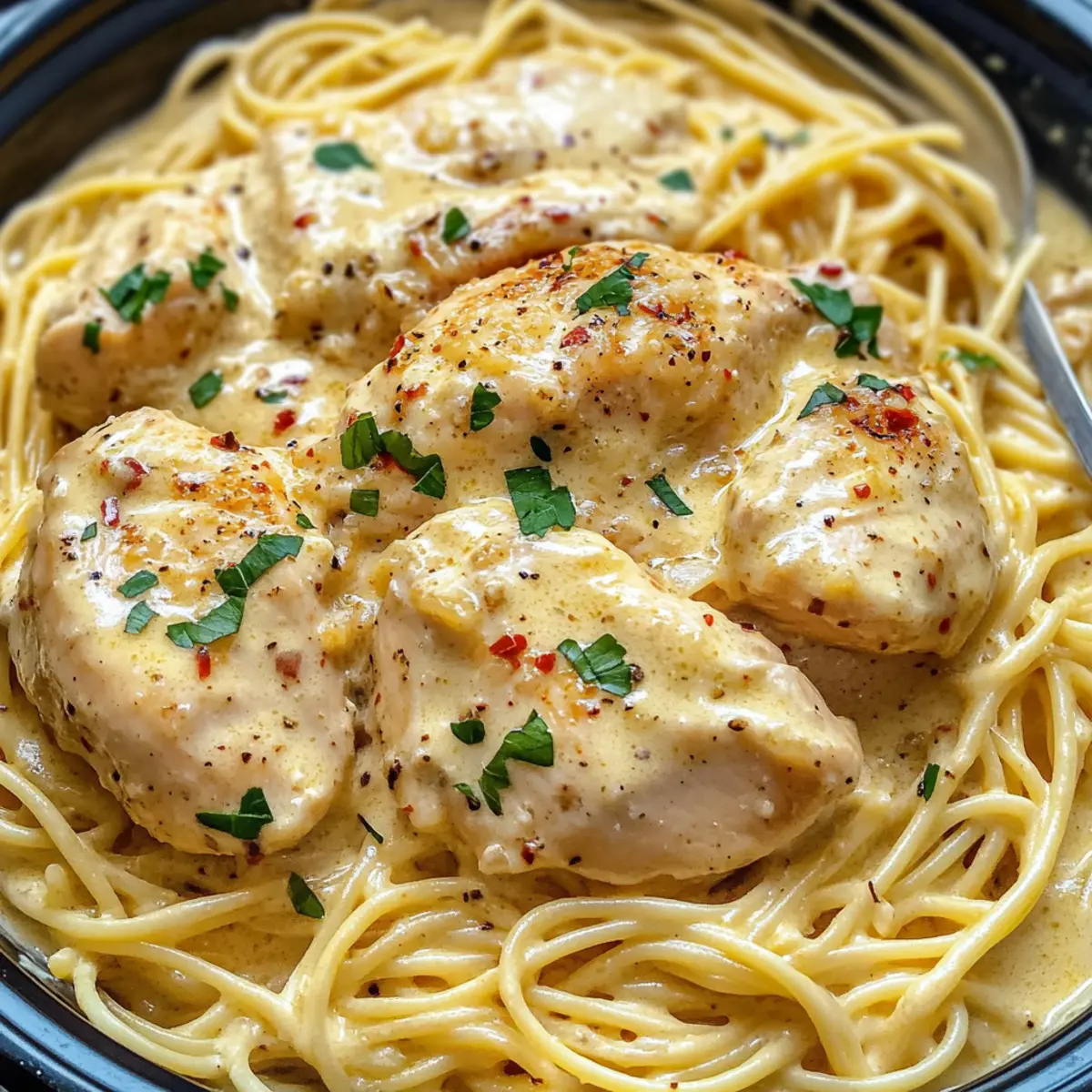 Zerfleddern Sie das Hähnchen nach Belieben mit zwei Gabeln und servieren Sie es großzügig über der Pasta. Träufeln Sie die reichhaltige Sauce darüber und garnieren Sie das Gericht mit frisch gehackter Petersilie, zerstoßenem Pfeffer und Parmesan, falls gewünscht. Genießen Sie ein wohltuendes Geschmackserlebnis!