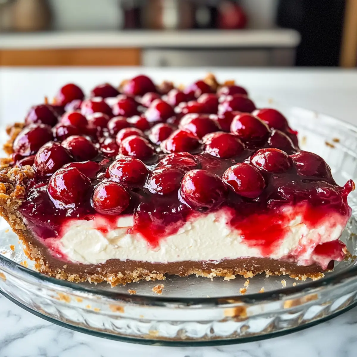 Jetzt ist es Zeit, die Kirsch-Pie-Füllung hinzuzufügen! Gieße die Kirschfüllung gleichmäßig über die Frischkäsefüllung und verteile sie mit einem Löffel oder Spatel sorgfältig, um eine schöne, gleichmäßige Schicht zu erhalten. Die leuchtende Farbe der Kirschen sorgt für einen appetitlichen Anblick und einen herrlichen Geschmack.