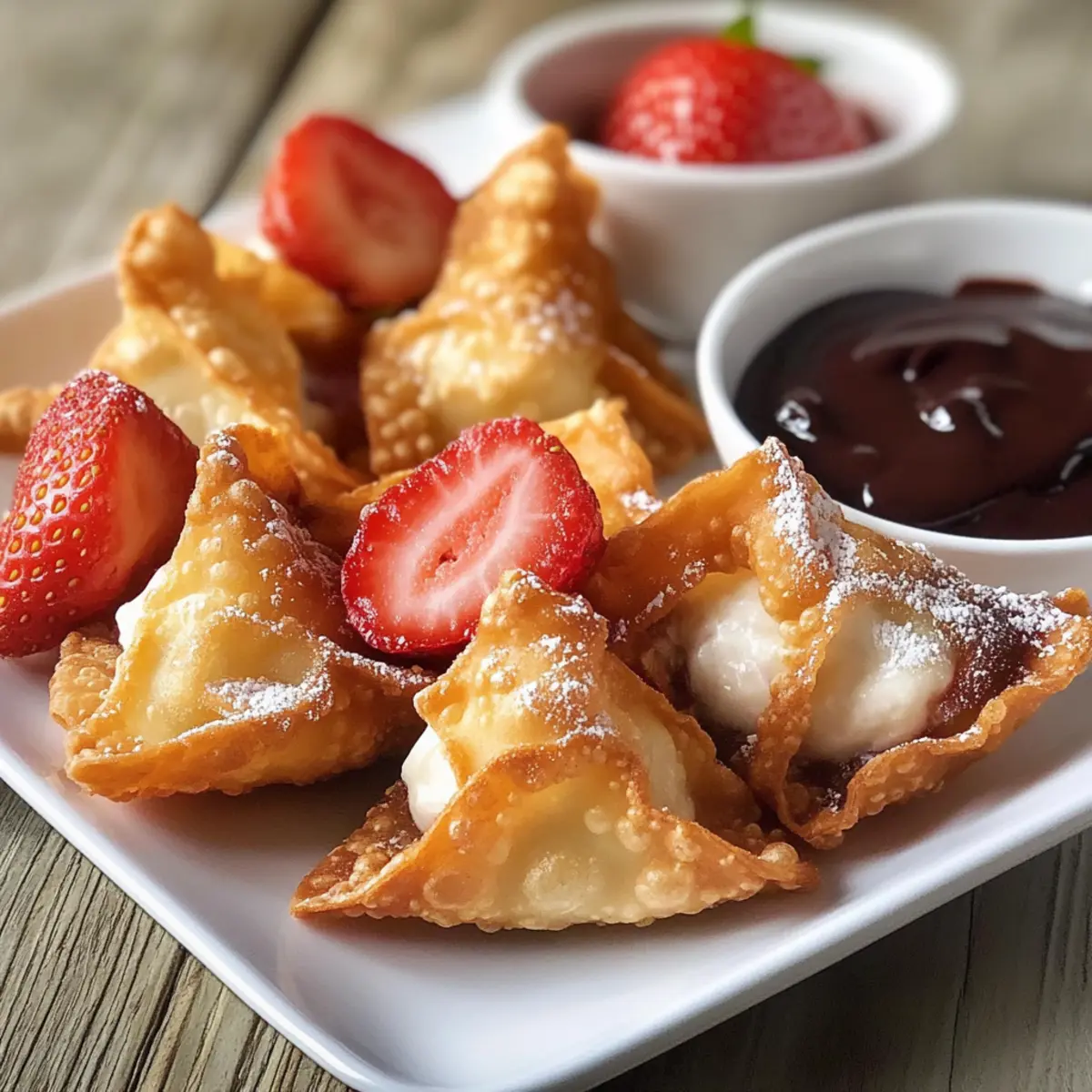 - Wontons vor dem Servieren mit Puderzucker bestäuben und optional mit Schokoladensauce oder Erdbeersauce genießen.