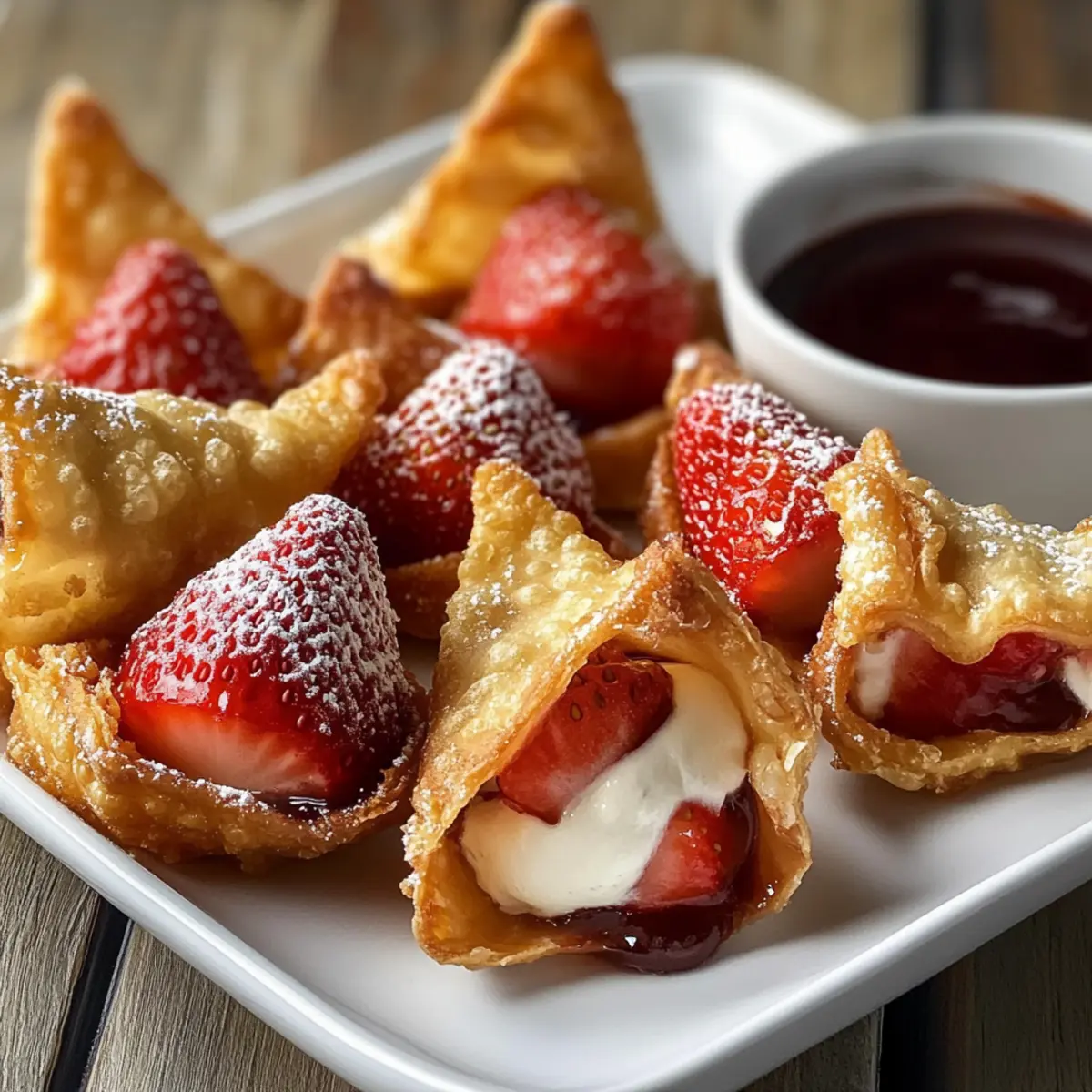 Puderzucker nicht vergessen: Bestäube die Wontons vor dem Servieren mit Puderzucker für eine süße, dekorative Note, die die Geschmacksfülle der Erdbeer-Käsekuchen-Wontons ergänzt.