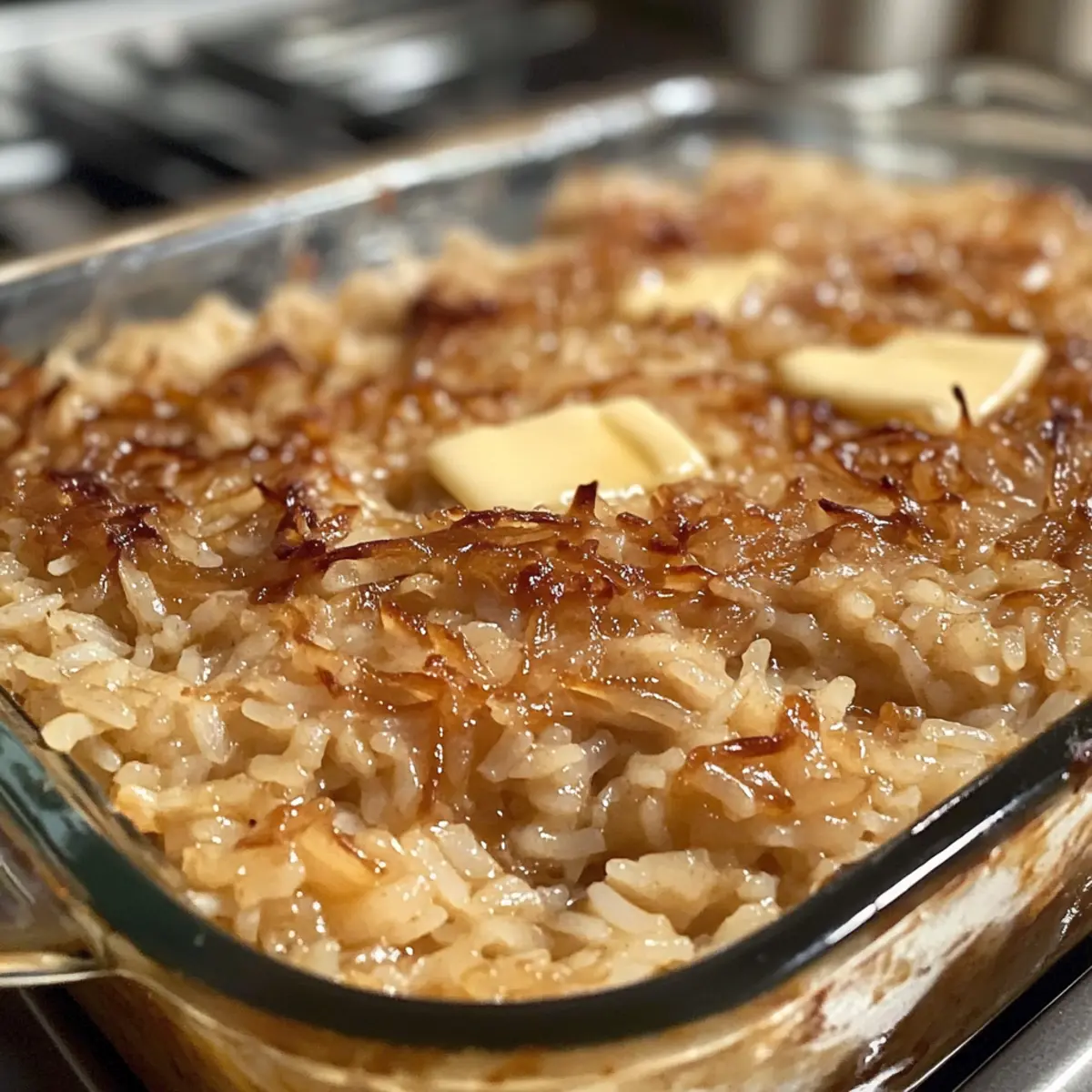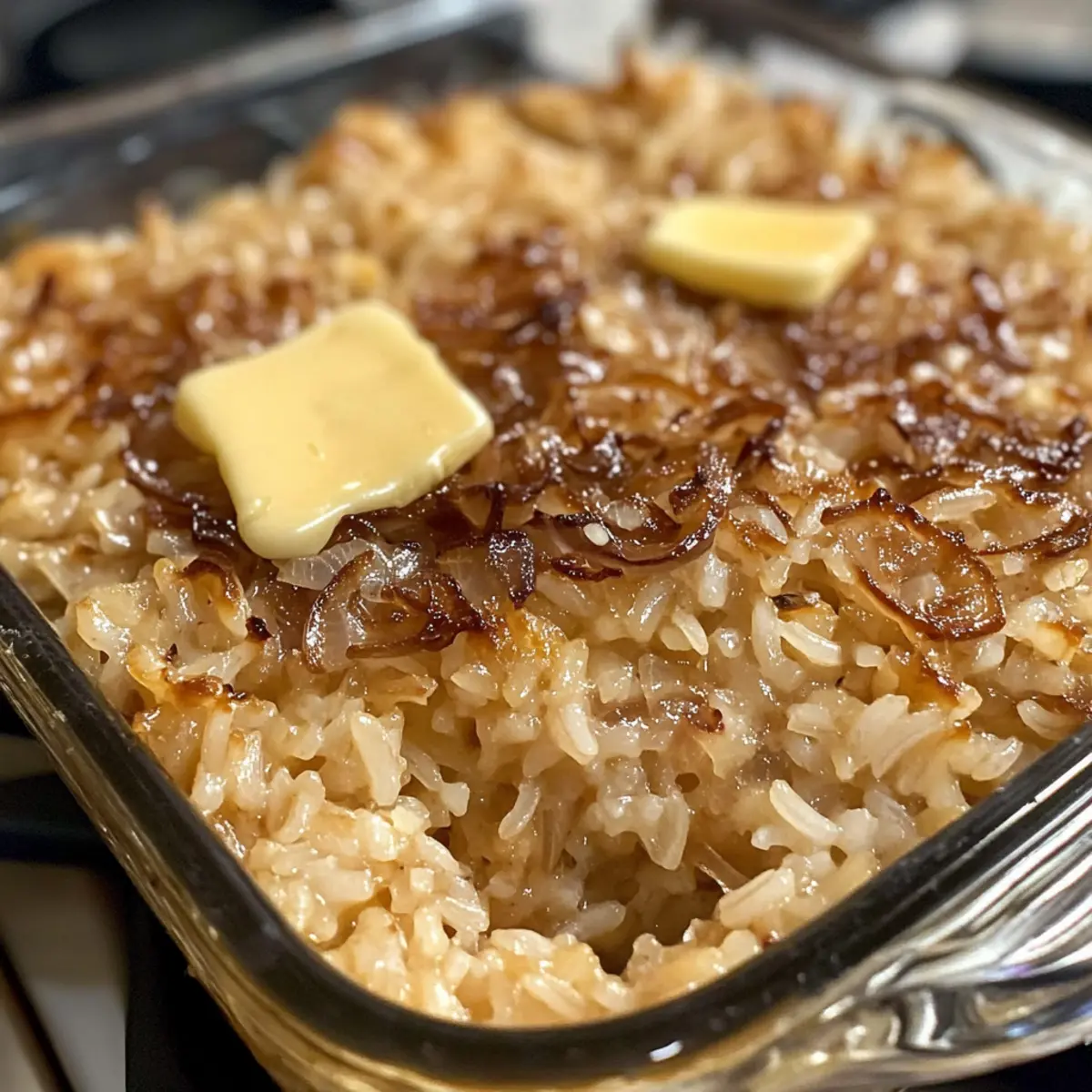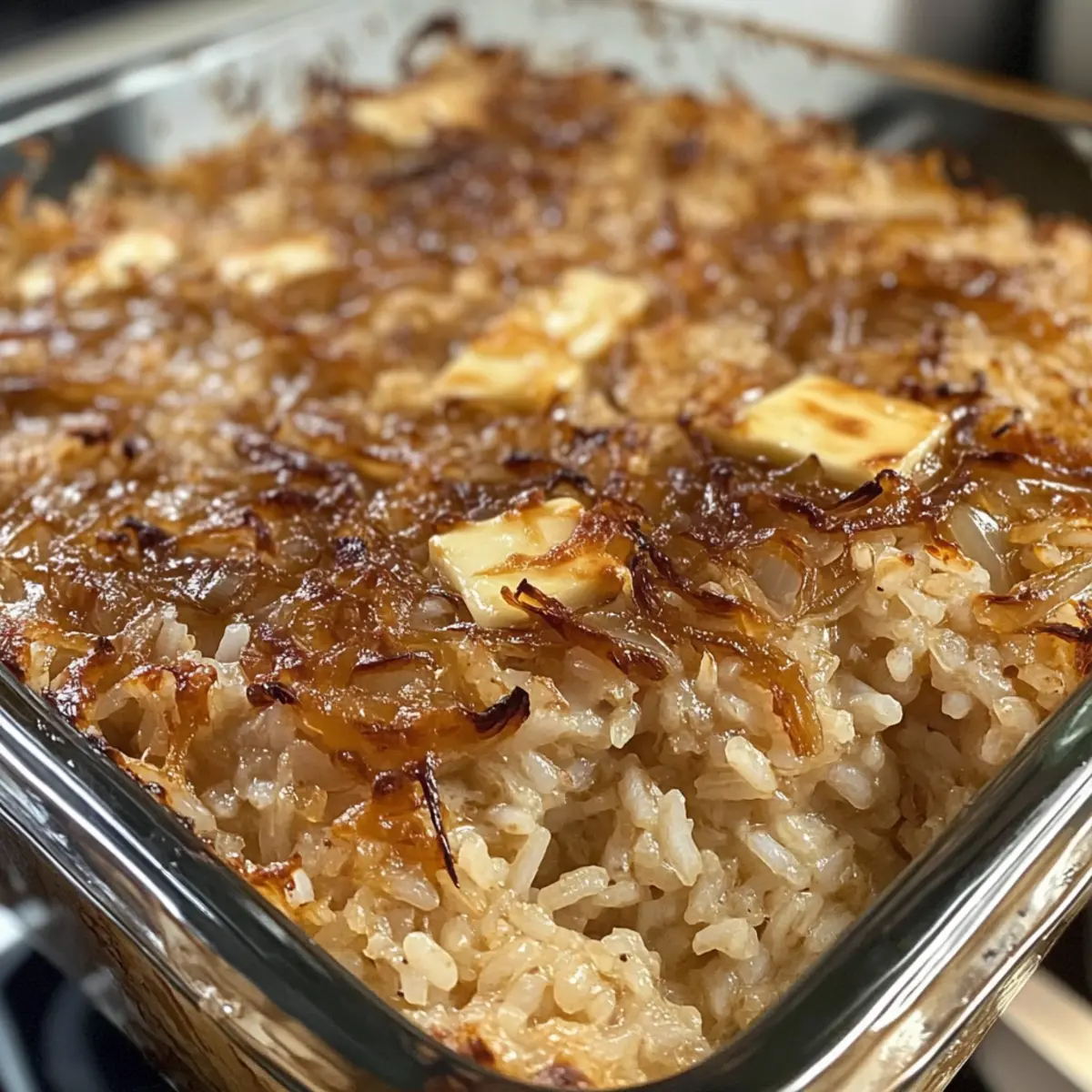 Verteile die in Scheiben geschnittene Butter gleichmäßig auf der Reis-Mischung. Diese Butterstücke schmelzen beim Backen und verleihen dem Gericht eine wunderbare Cremigkeit und zusätzlichen Geschmack. Es ist die perfekte Abrundung für deinen Französischen Zwiebelreis.