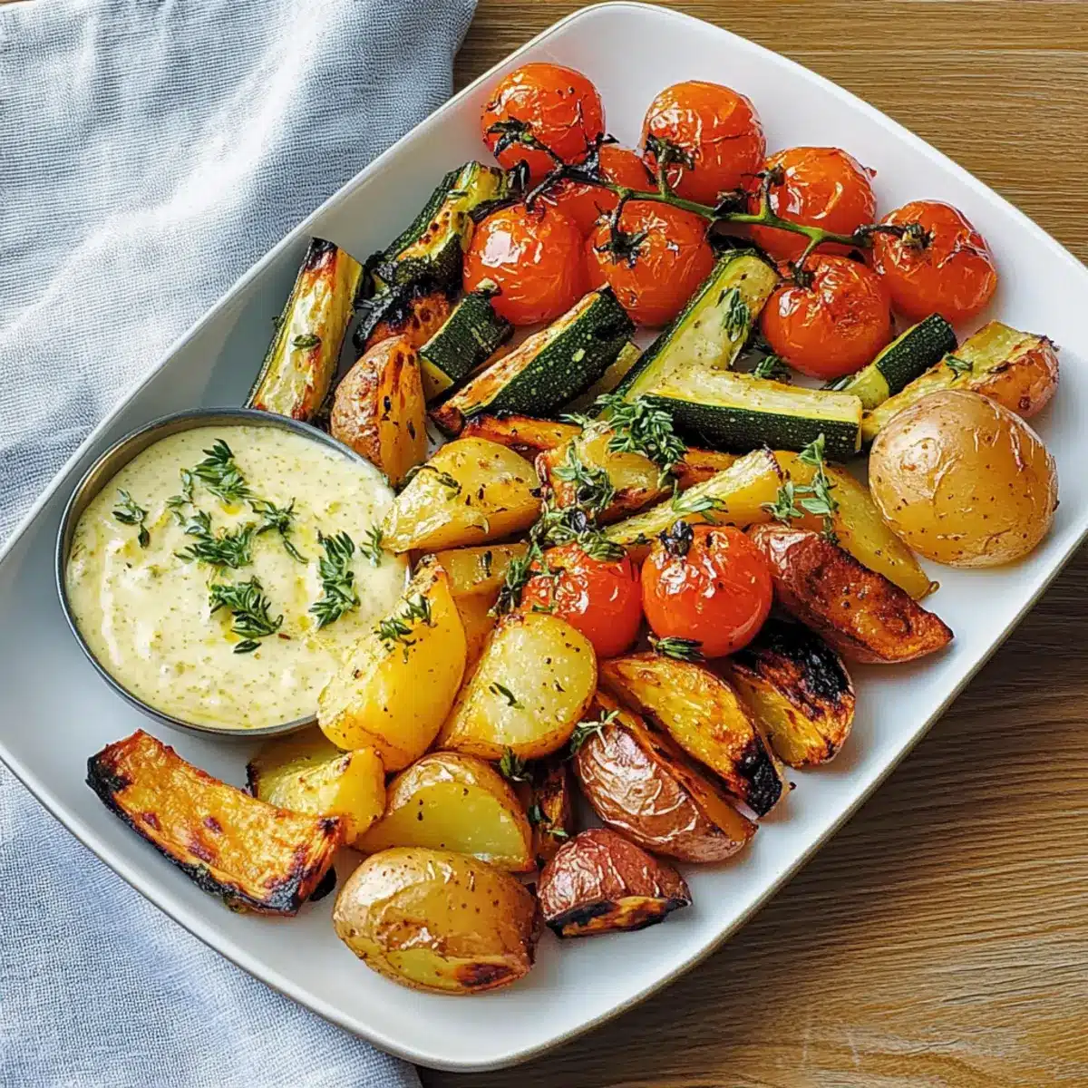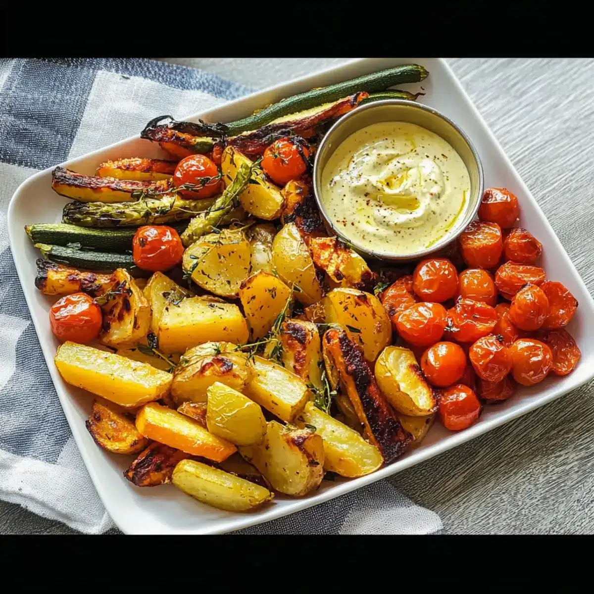 - Serviere das frisch geröstete Gemüse heiß, begleitet von dem cremigen Currydip.
