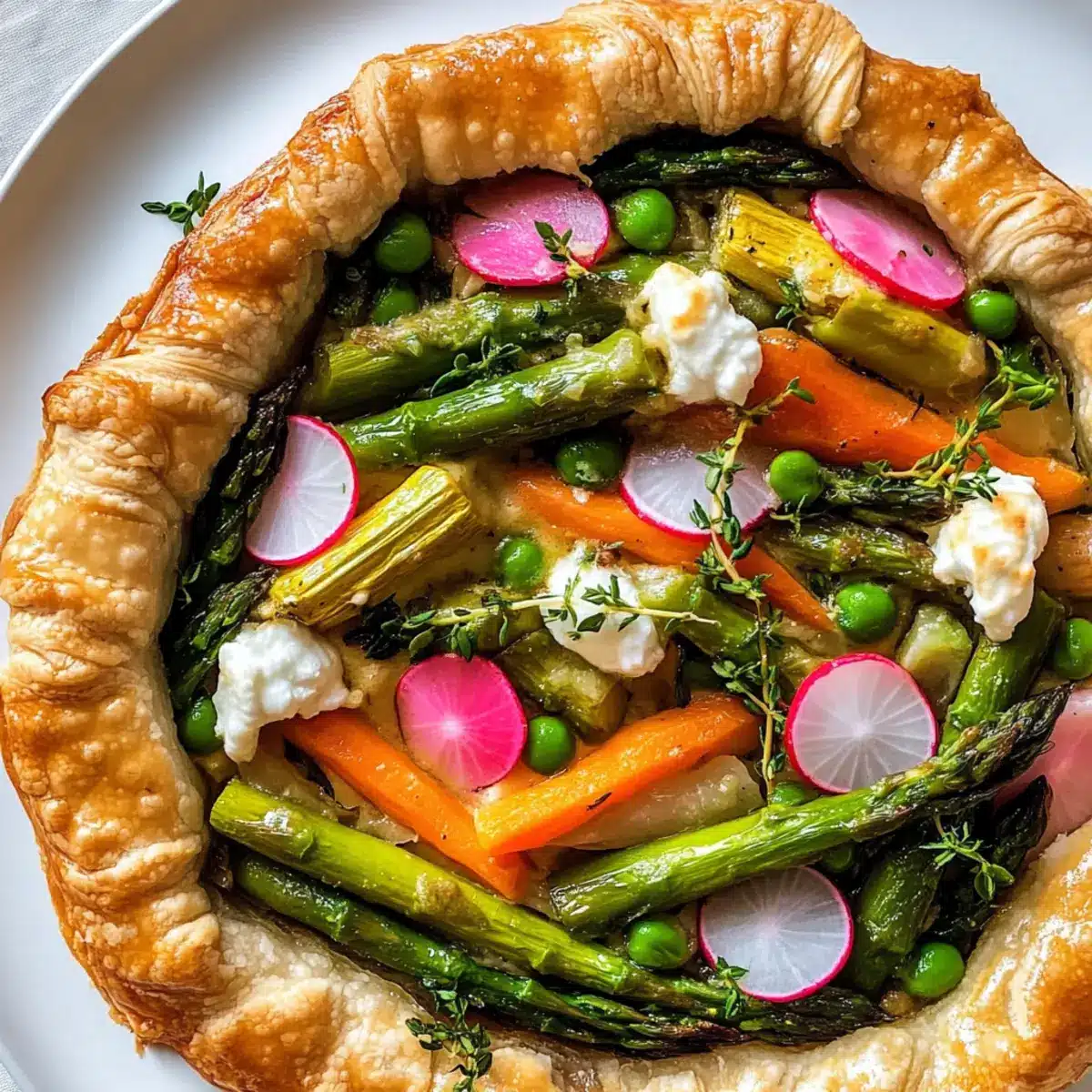 Bröckele den frischen Ziegenkäse gleichmäßig über das Gemüse. Streue frische Thymianblätter und Zitronenschale darüber, um die Aromen zu intensivieren. Falte dann die Ränder des Teigs über die Füllung, sodass das Gemüse teilweise bedeckt ist.