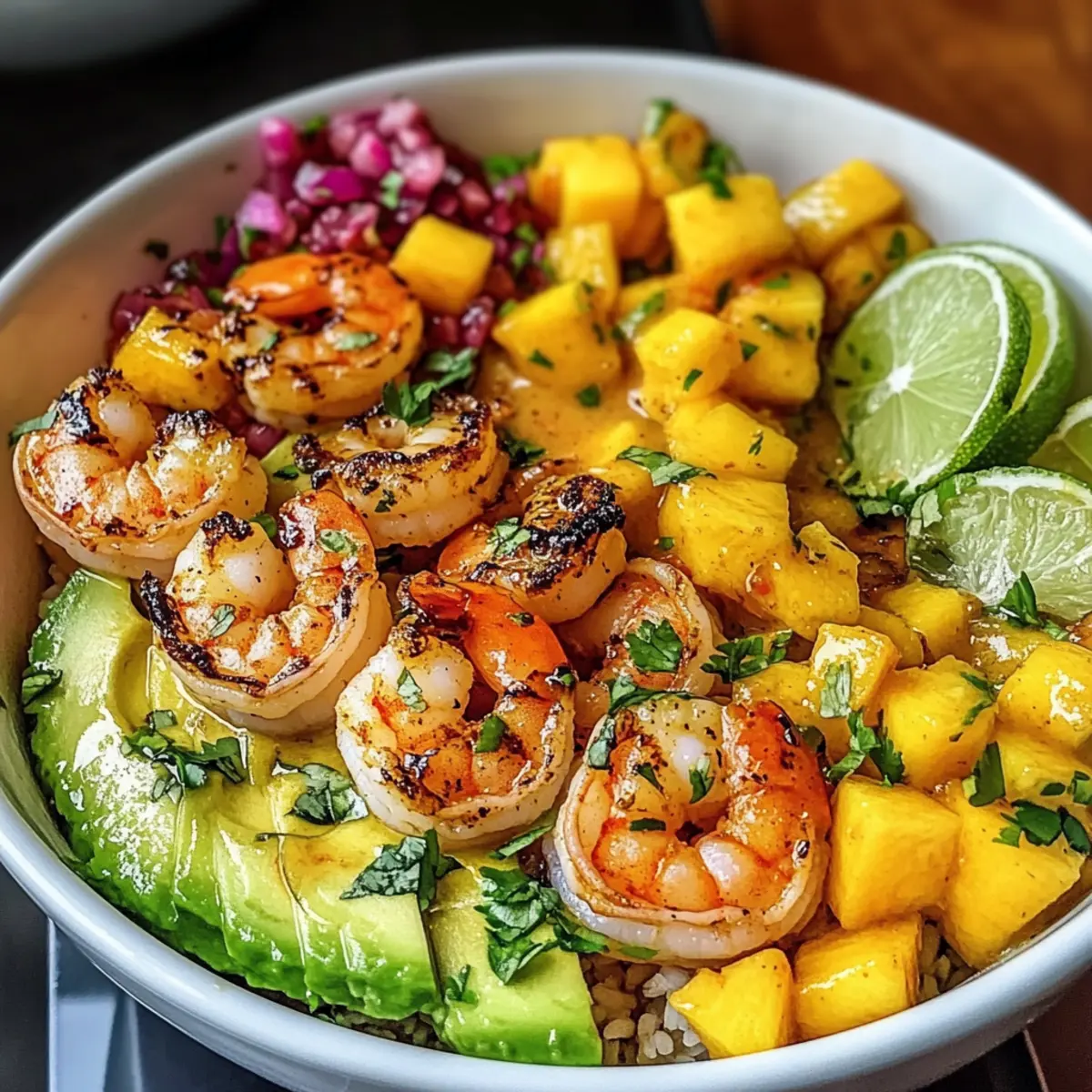 - Richte die Schalen an, indem du den Reis als Basis legst, darauf Garnelen und Avocado schichtest und mit Mangosalsa und Limetten-Chili-Sauce garnierst.
