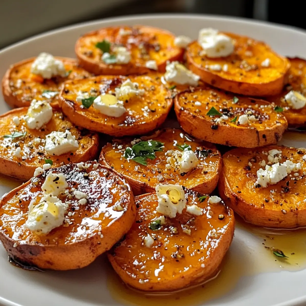 Geröstete Süßkartoffelrunden mit Honig und Feta