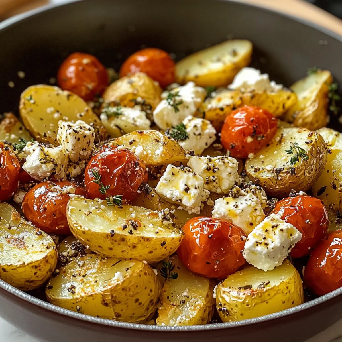 Nehme die Auflaufform aus dem Ofen und lasse sie kurz abkühlen. Rühre den weichen Feta vorsichtig mit dem Gemüse um, bis eine cremige Sauce entsteht. Garniere die gesunden Ofenkartoffeln nach Belieben mit frischen Kräutern und serviere sie direkt. Dieses aromatische Gericht wird sowohl warm als auch kalt zum Genuss.