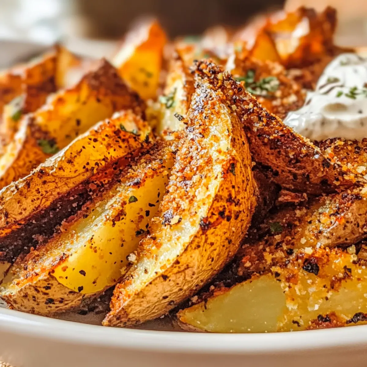 Dip-Diversität: Experimentiere mit verschiedenen Dips! Neben Sauerrahm eignen sich auch BBQ-Sauce oder Aioli hervorragend zu diesen Gewürzten Ofenkartoffelspalten.
