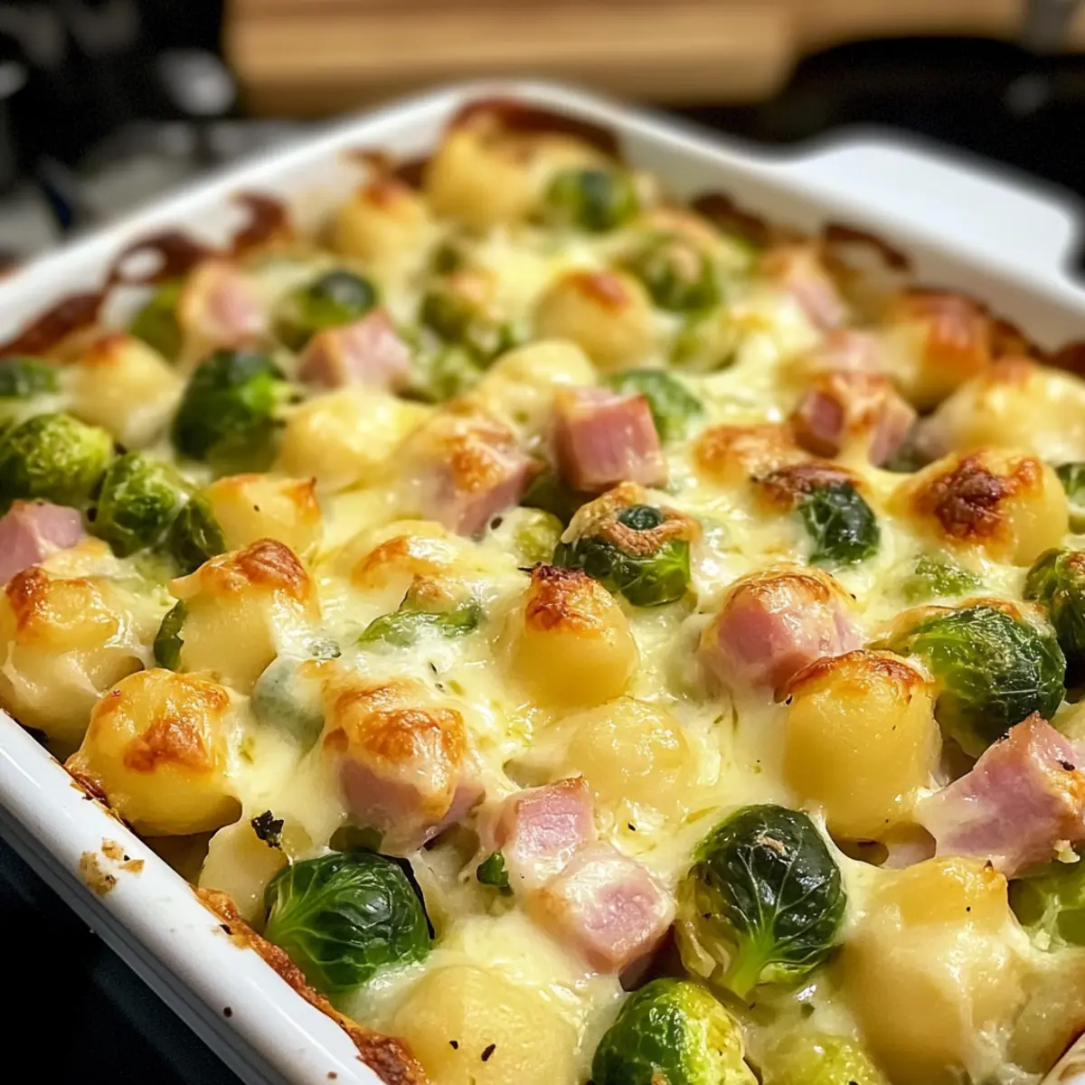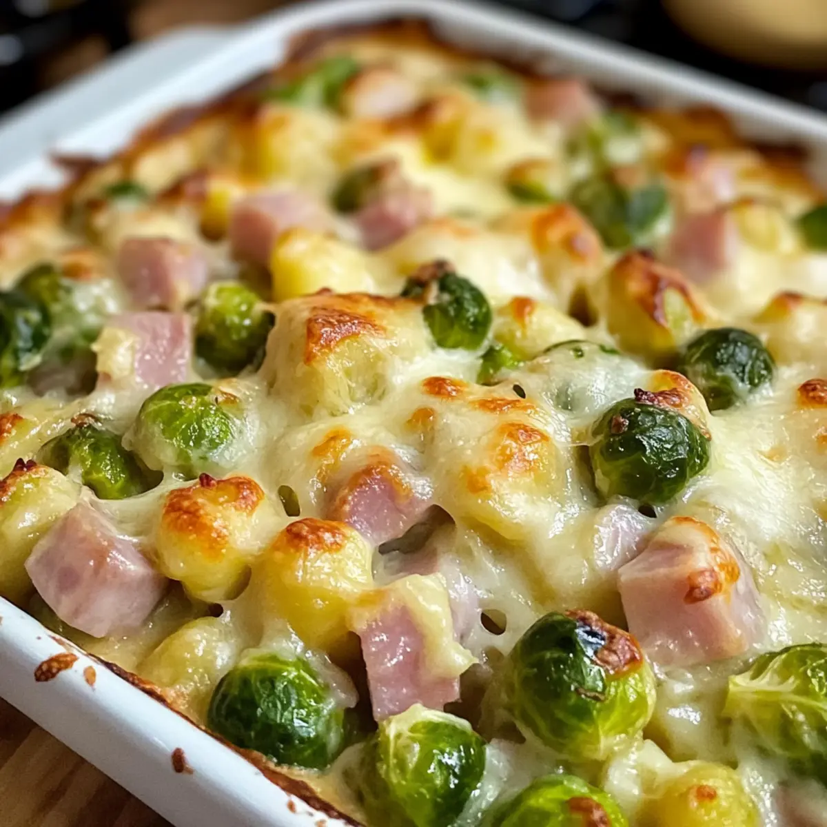 Herzhafter Genuss: Die Kombination aus cremiger Sahne, würzigem Schinken und knackigem Rosenkohl macht jeden Bissen zu einem wahren Geschmackserlebnis.