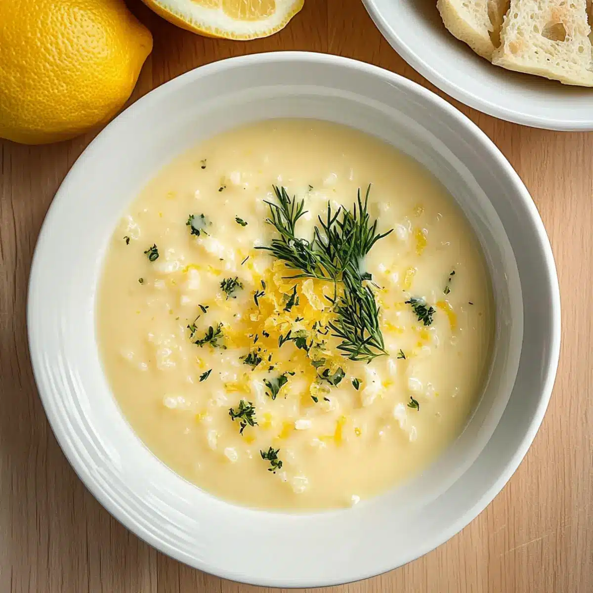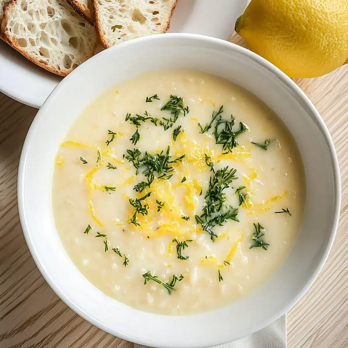 Die Zitronenschale in die Suppe einrühren und mit Salz und frisch gemahlenem schwarzem Pfeffer abschmecken. Achten Sie darauf, die Aromen auszubalancieren, so dass die Helligkeit der Zitrone hervorsticht. Die Garnitur mit frischem Dill oder Petersilie rundet die Präsentation der Griechischen Eier-Zitronen-Suppe ab.