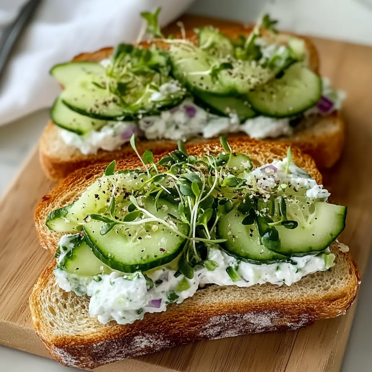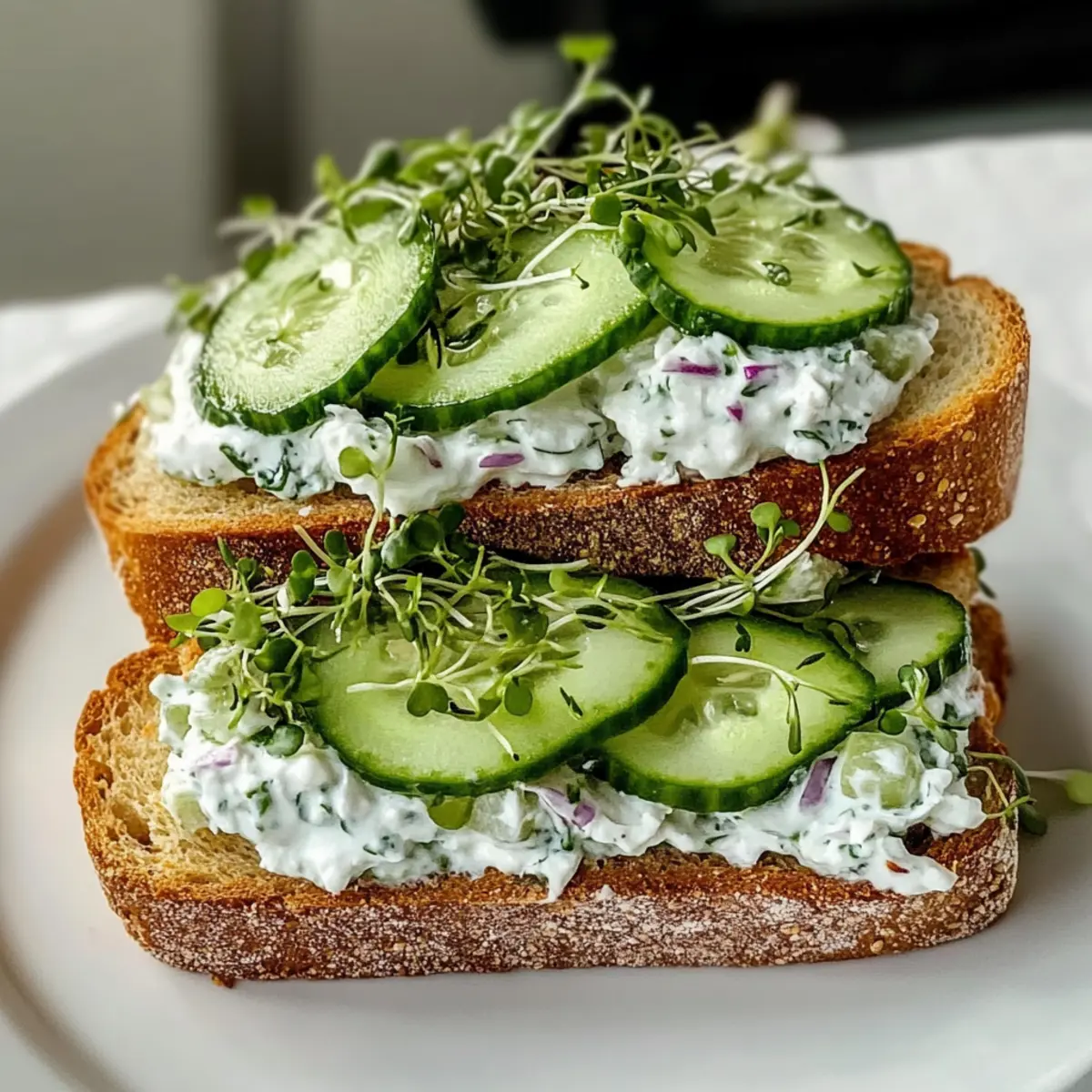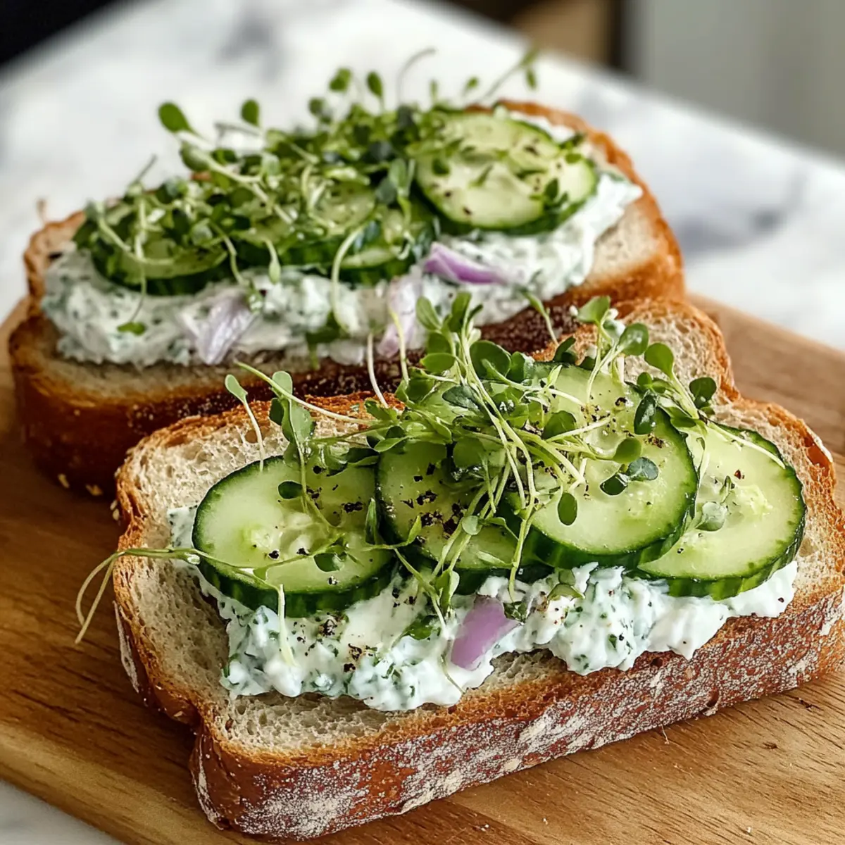 - Sandwiches zusammenstellen: Lege die Gurkenmischung und Sprossen zwischen zwei Brotscheiben.