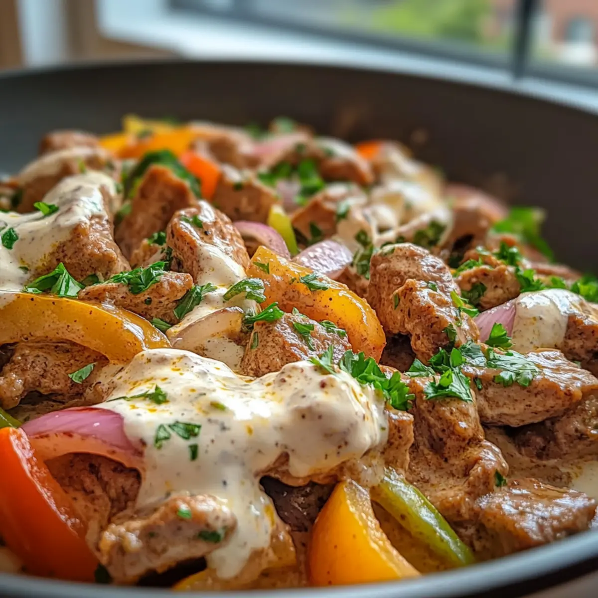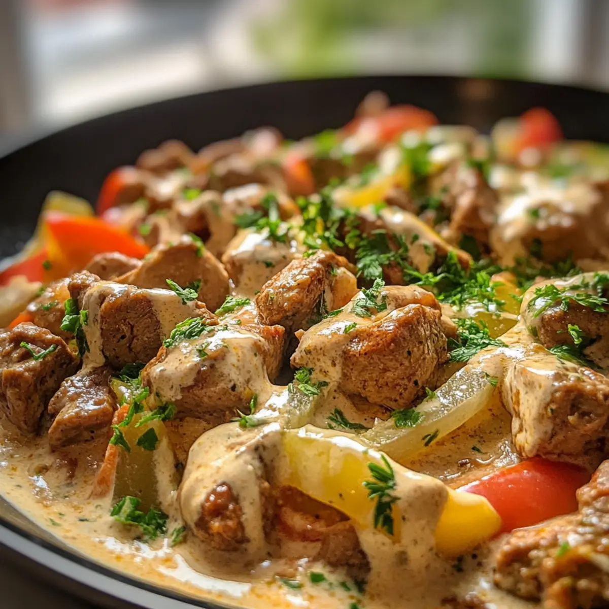 Mediterraner Genuss: Zarte Rindfleischstücke und die cremige Käsesauce verschmelzen zu einem aufregenden Geschmackserlebnis, das Urlaubserinnerungen weckt.