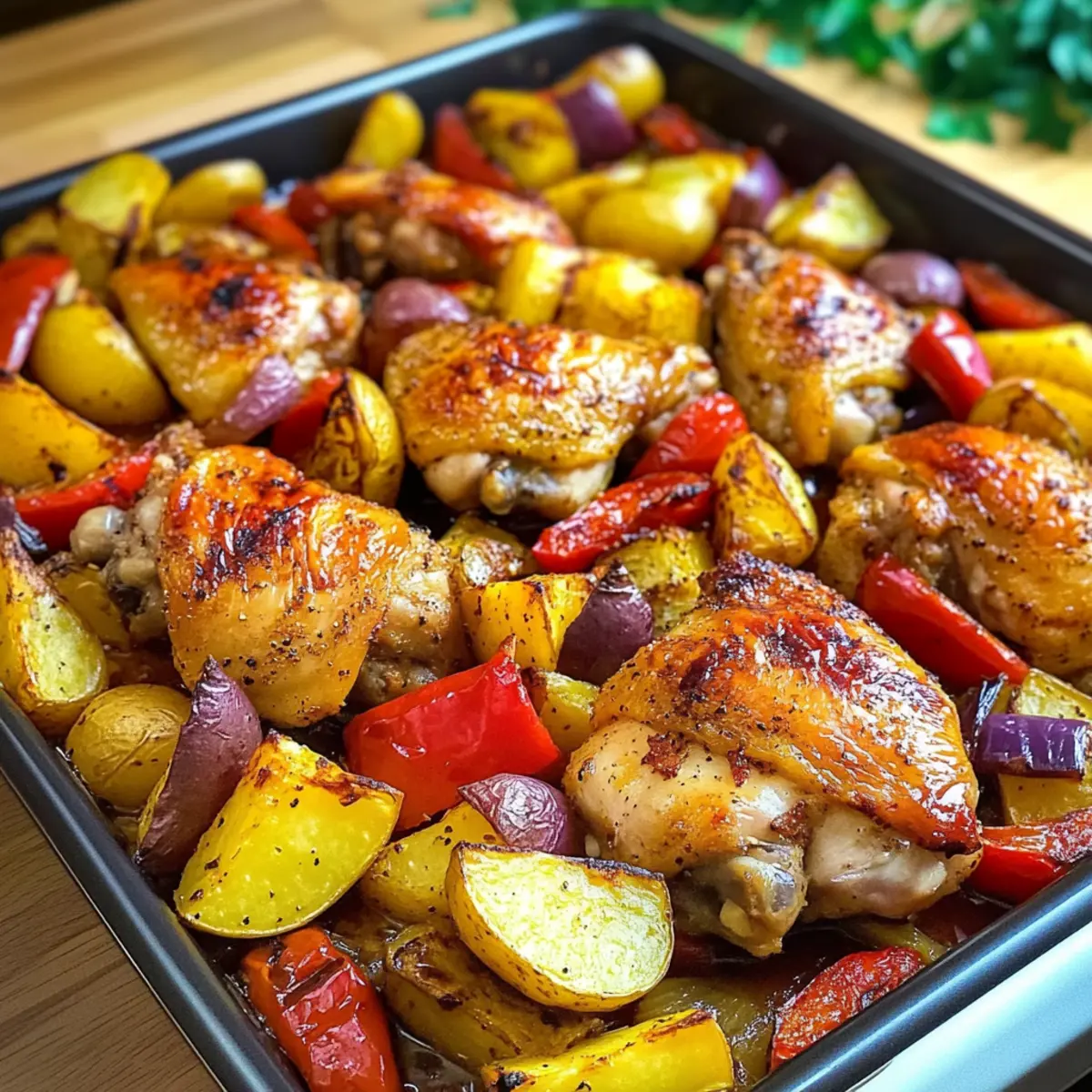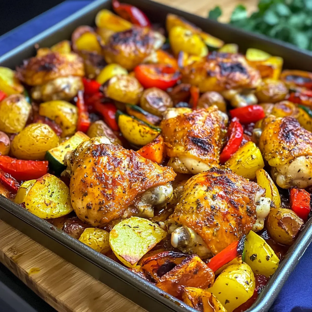 Hähnchenoberkeulen gebacken mit knusprigen Kartoffeln