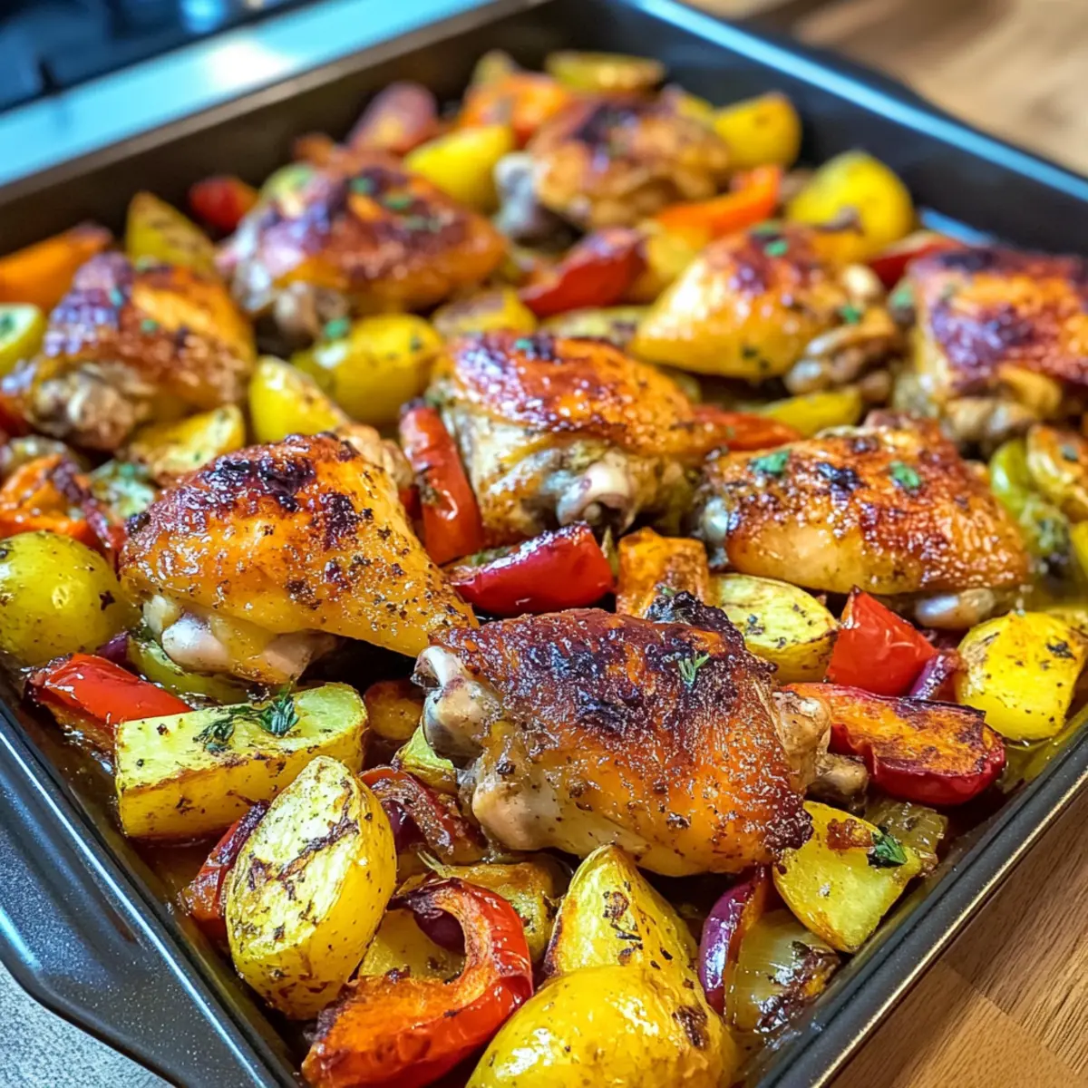 Der Duft von aromatischem Gemüse und knusprigen Kartoffeln macht jede Mahlzeit zu einem Fest der Sinne und ergänzt die Hähnchenoberkeulen perfekt.