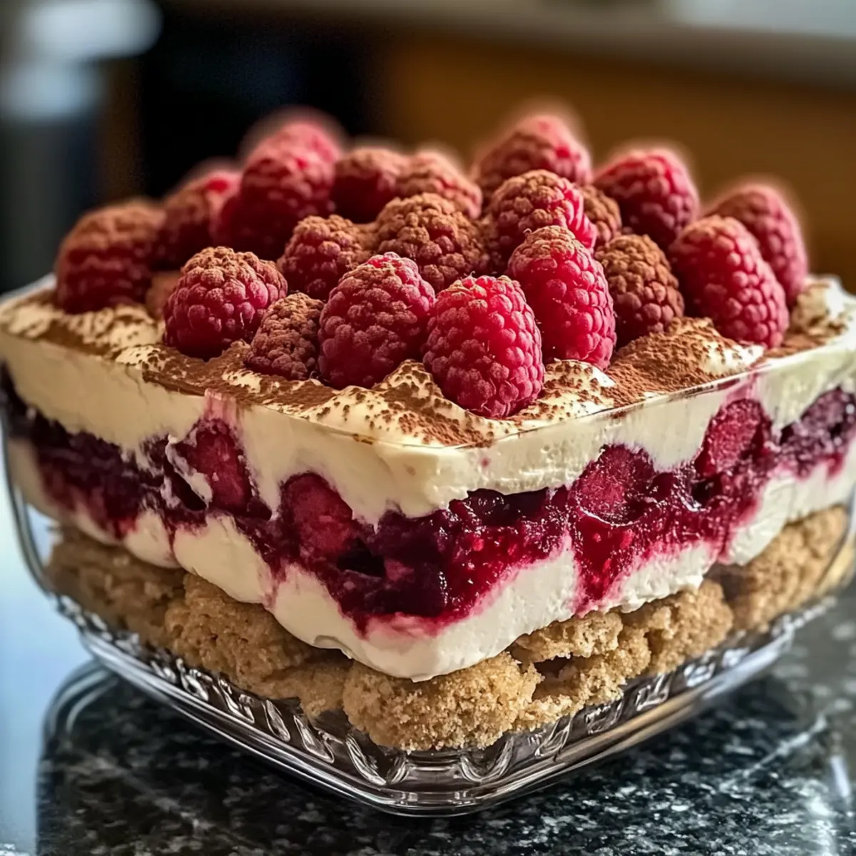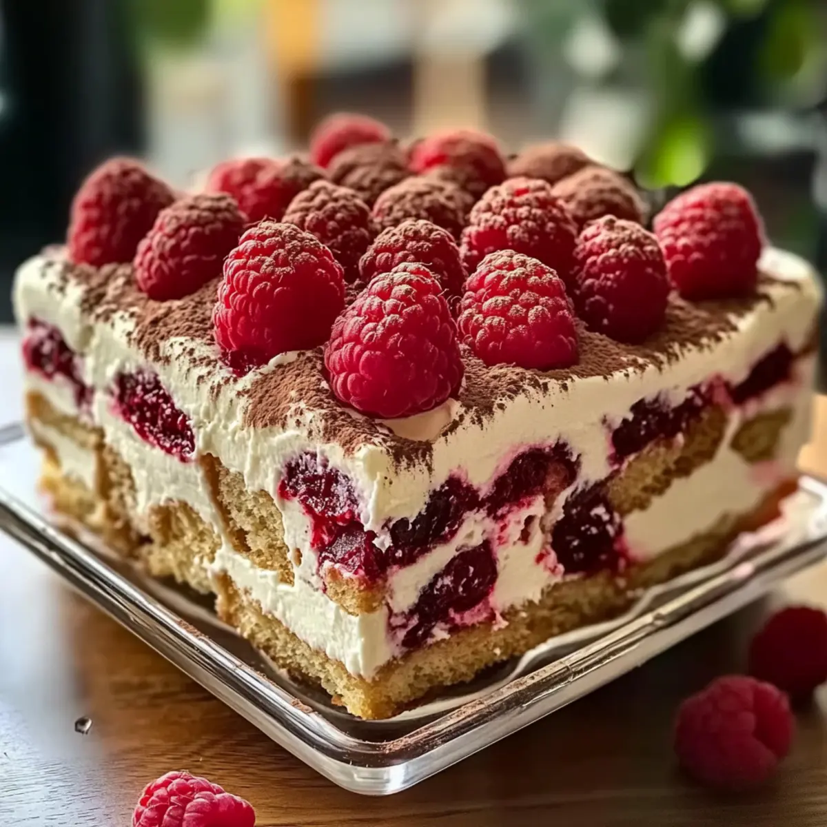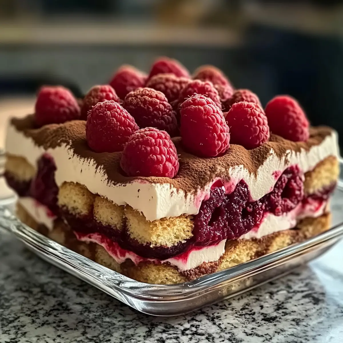 - Bestäube die Oberfläche des Tiramisu gleichmäßig mit Kakaopulver und füge einige frische Himbeeren zur Garnitur hinzu. Serviere es kalt.