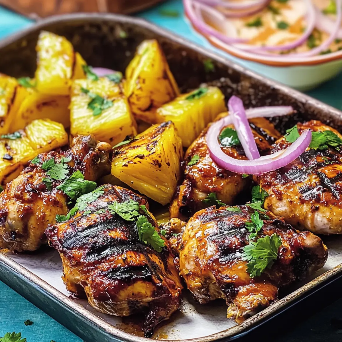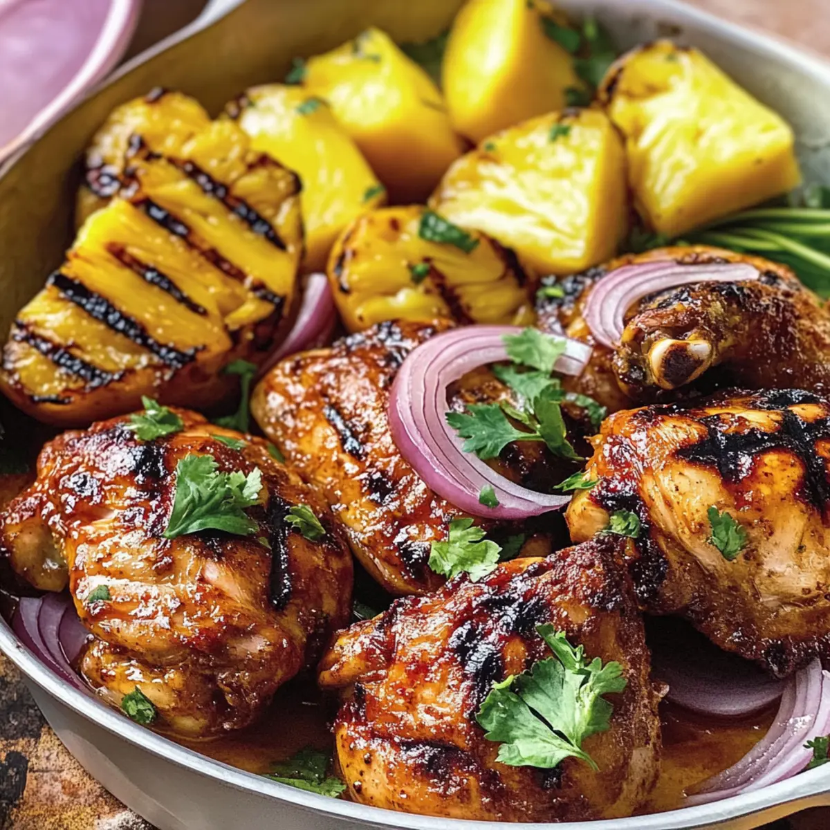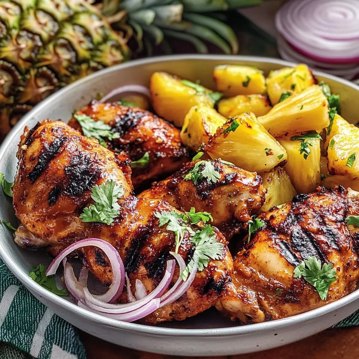 - Serviere die gegrillten Hähnchenschenkel zusammen mit der karamellisierten Ananas und garniere die Mahlzeit mit geschnittenen roten Zwiebeln und frischem Koriander.