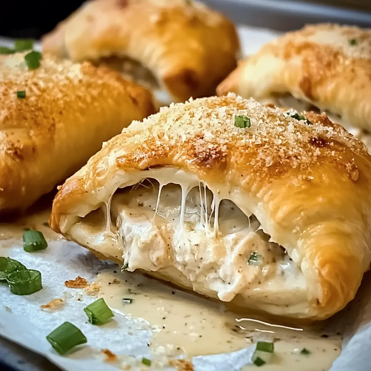- Drizzle die cremige Parmesan-Sauce über die Hühnchenkissen und serviere sie warm.