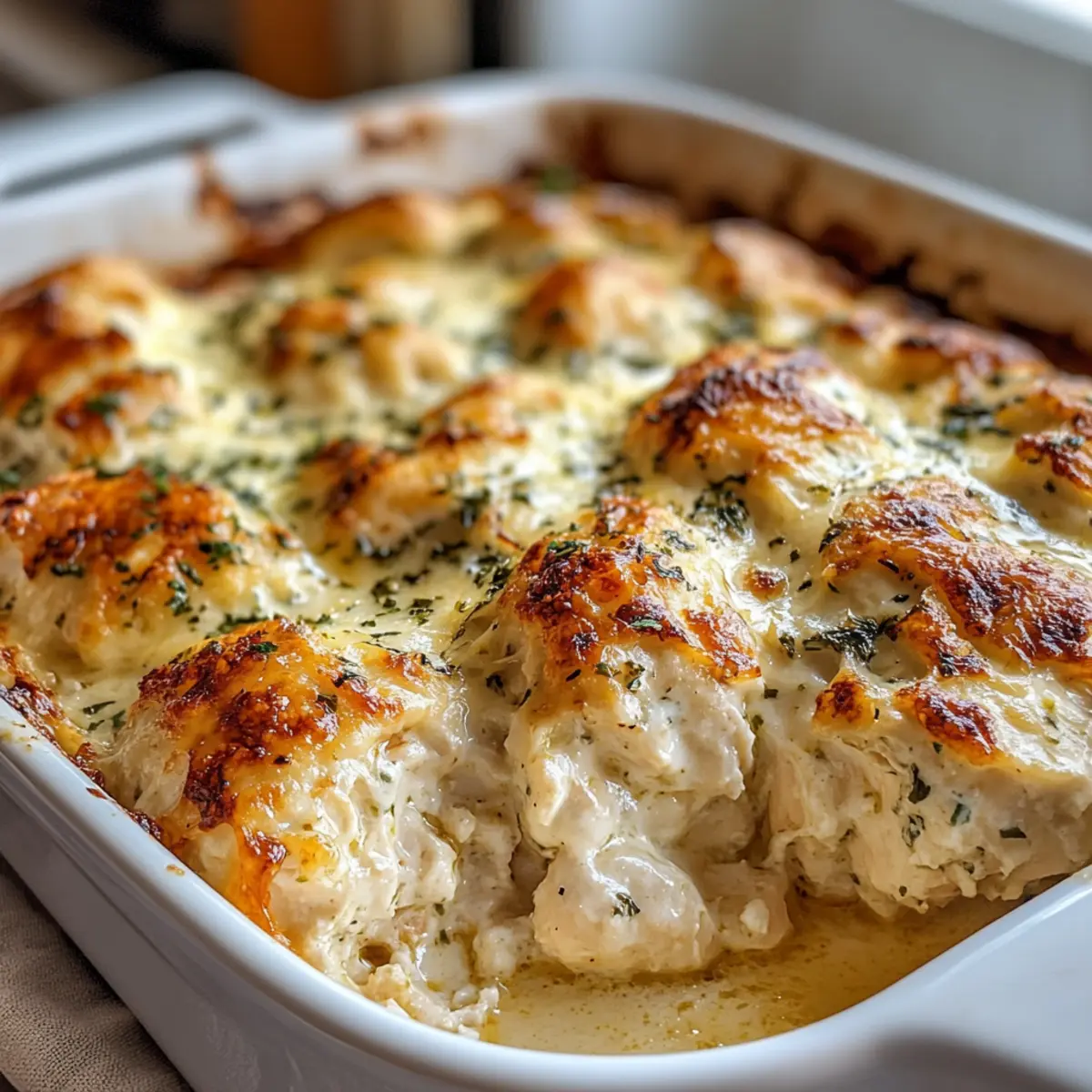 Backe den Hüttenkäse Hähnchenauflauf unbedeckt für 30–35 Minuten im vorgeheizten Ofen. Achte darauf, dass das Hähnchen eine Innentemperatur von 74°C (165°F) erreicht und die Sauce an den Rändern leicht blubbernd und goldbraun wird. Dies sorgt für eine köstliche Kruste.