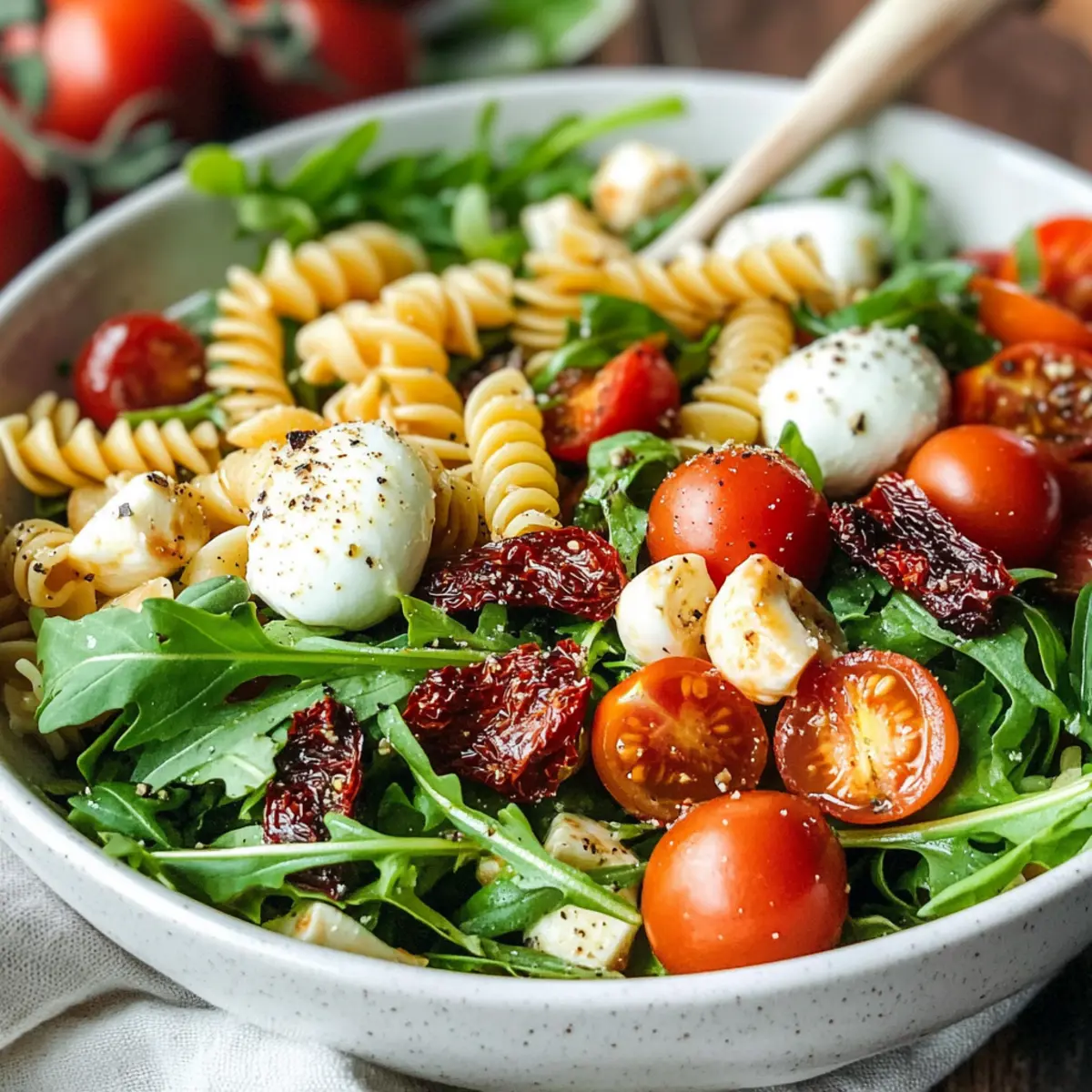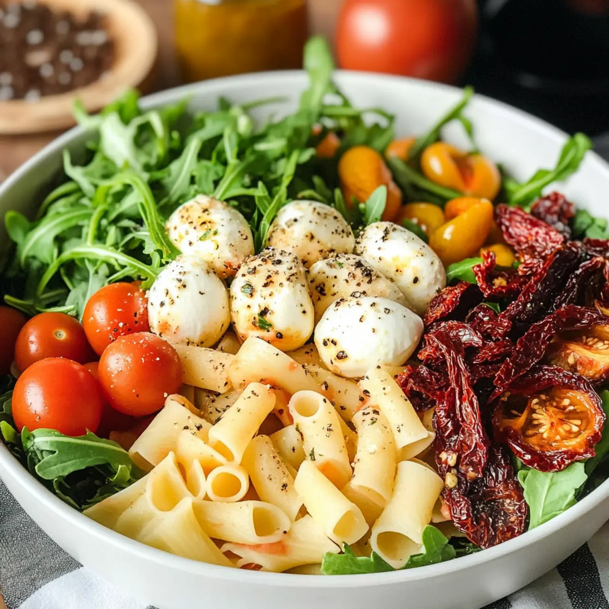 Verteilen Sie den Rucola gleichmäßig auf zwei große Schalen als Basis. Platzieren Sie die abgekühlten Nudeln, die frisch geschnittenen Cocktail- und getrockneten Tomaten, die Oliven und die Mozzarellabällchen kunstvoll auf dem Rucola. Achten Sie darauf, jede Zutat sichtbar anzurichten, um eine appetitliche Präsentation zu erreichen.