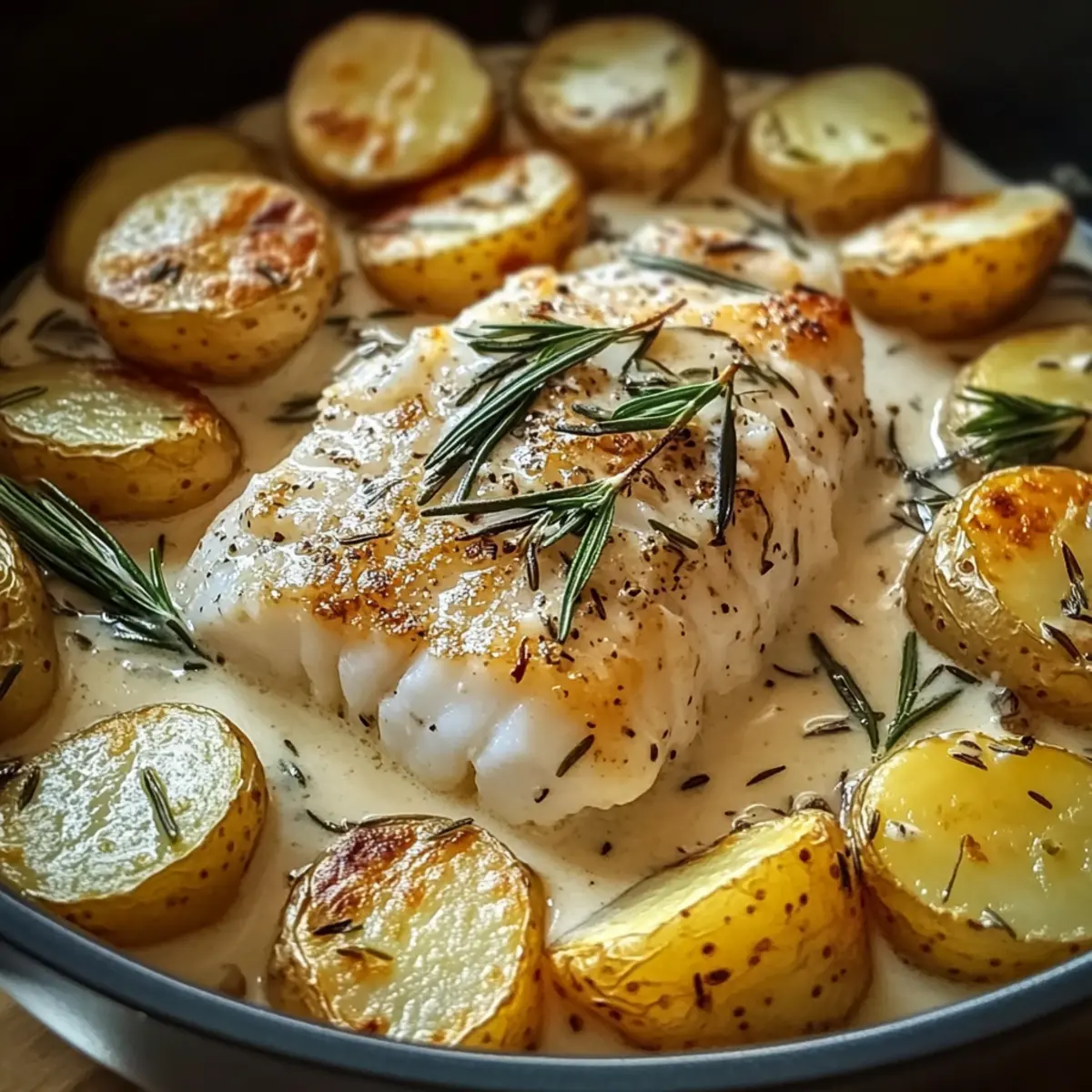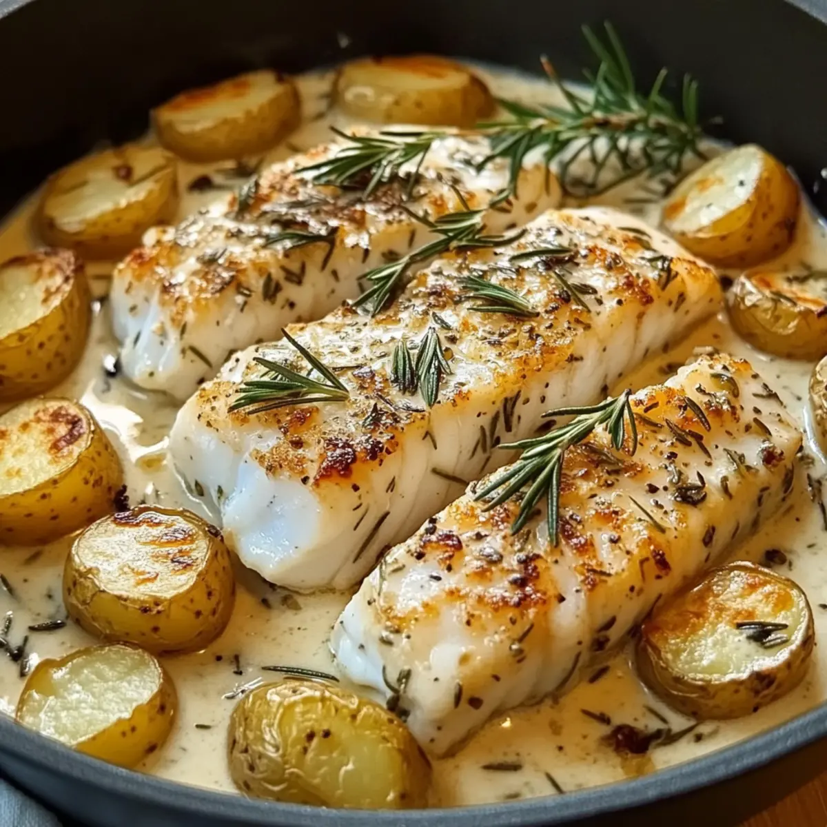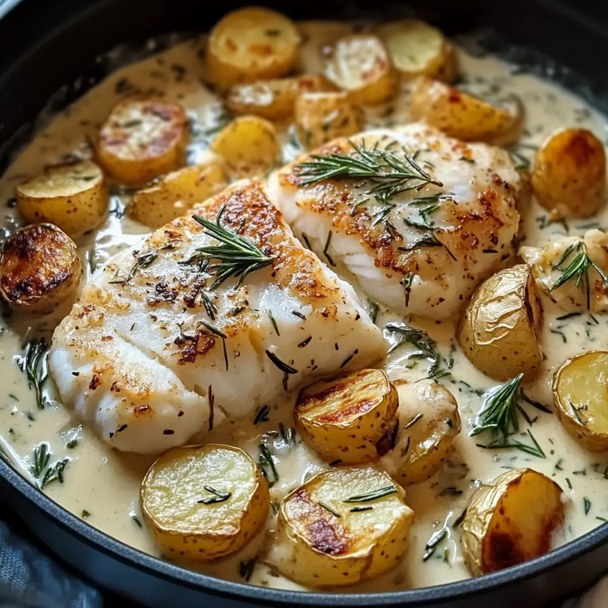 Dieses köstliche Kabeljau und Kartoffeln mit Rosmarin-Sahnesauce wird deine Geschmacksknospen verwöhnen und ist dennoch einfach zuzubereiten!