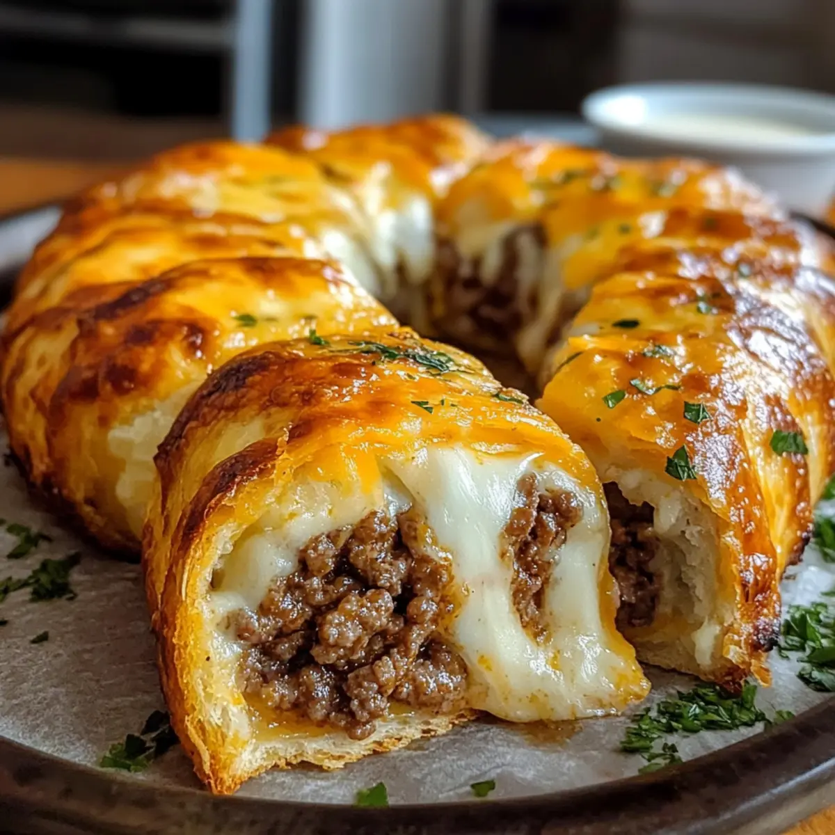 Lassen Sie die Käse Rinderhackfleisch Rolle nach dem Backen für etwa 5 Minuten ruhen, bevor Sie sie in dicke Scheiben schneiden. Garnieren Sie mit frischer Petersilie und servieren Sie die Rolle warm – so bleibt sie saftig und schmackhaft für alle!