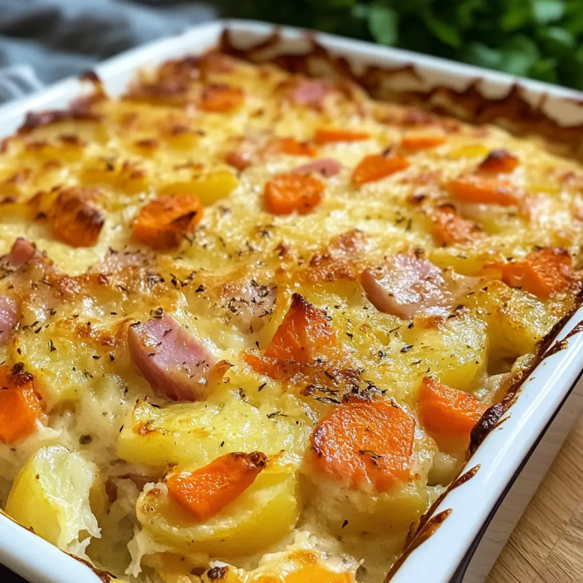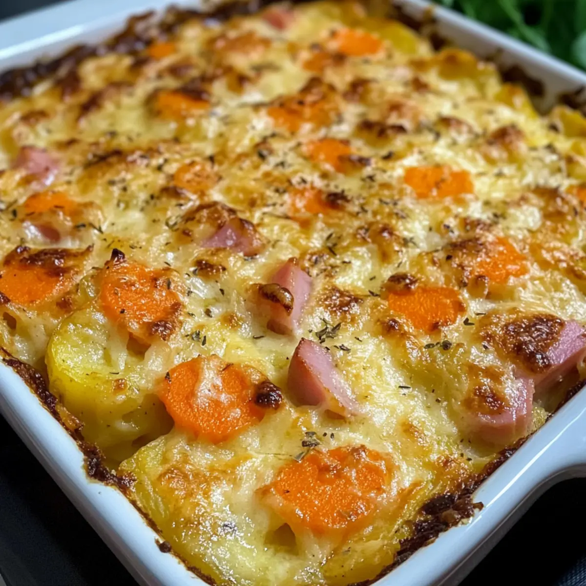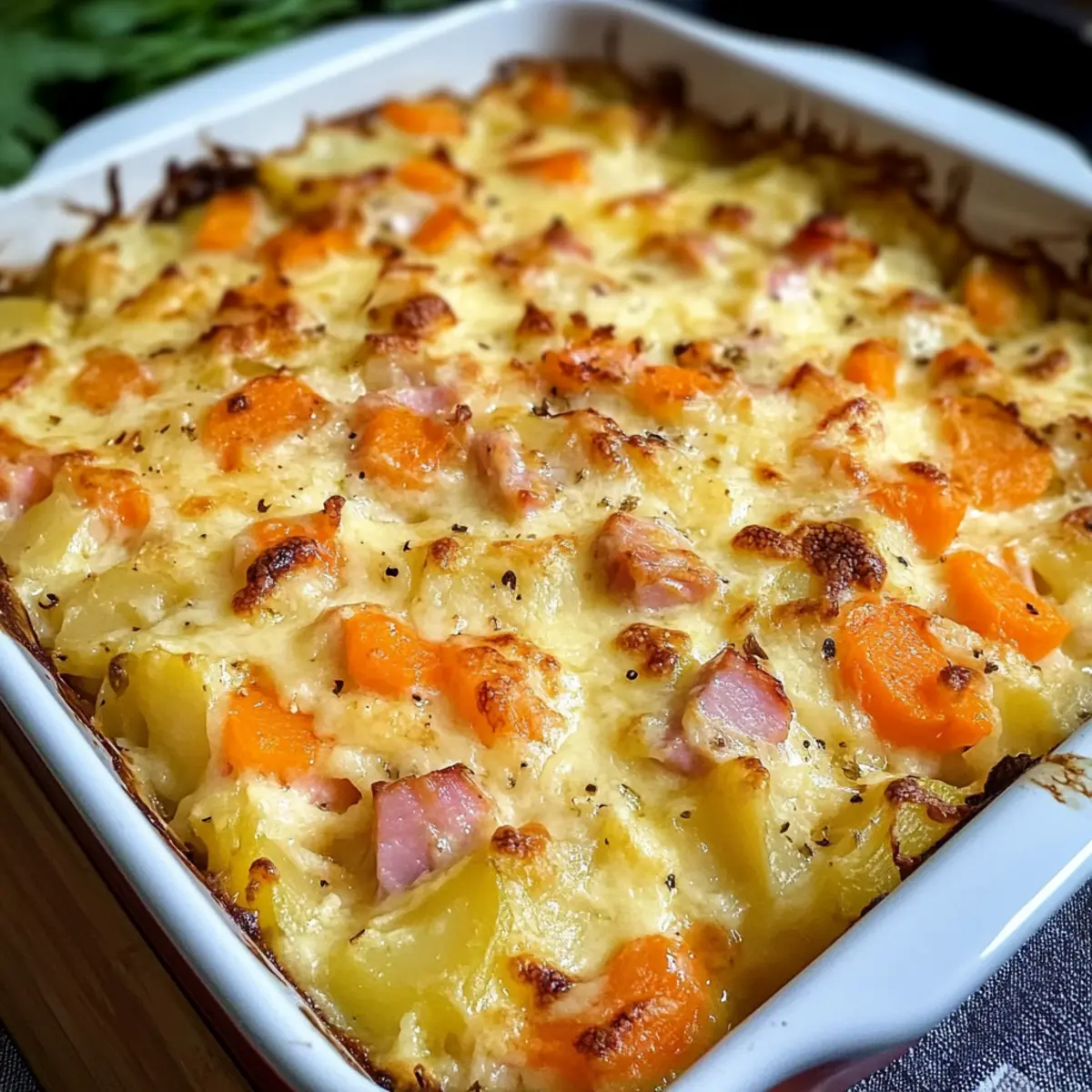 Herzhafter Kartoffel- und Karottenauflauf mit Schinken