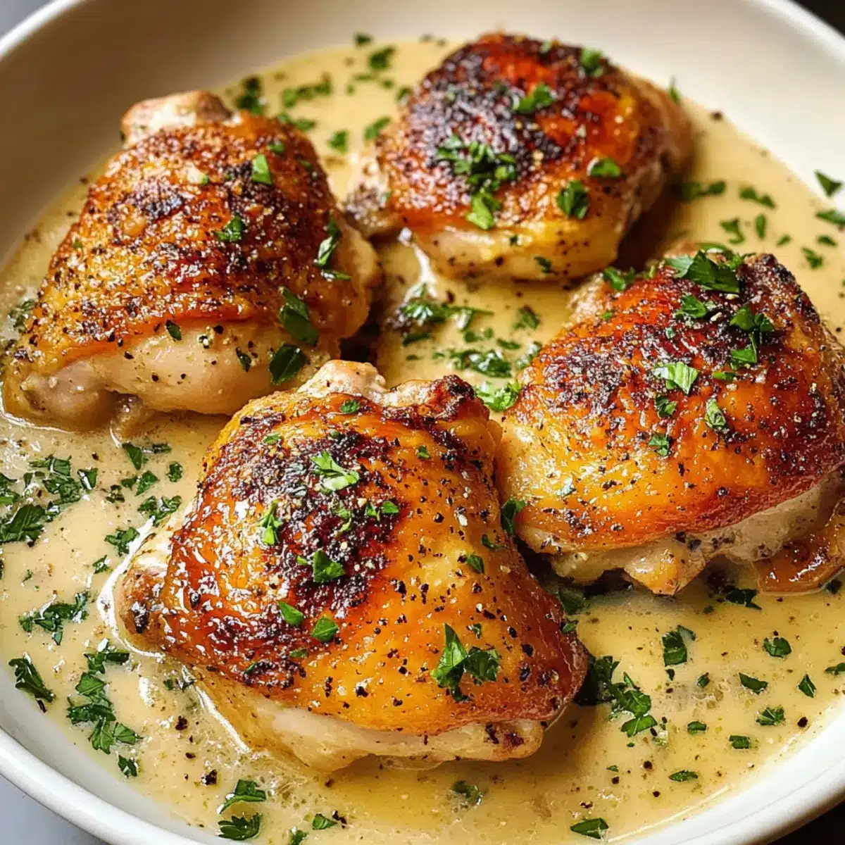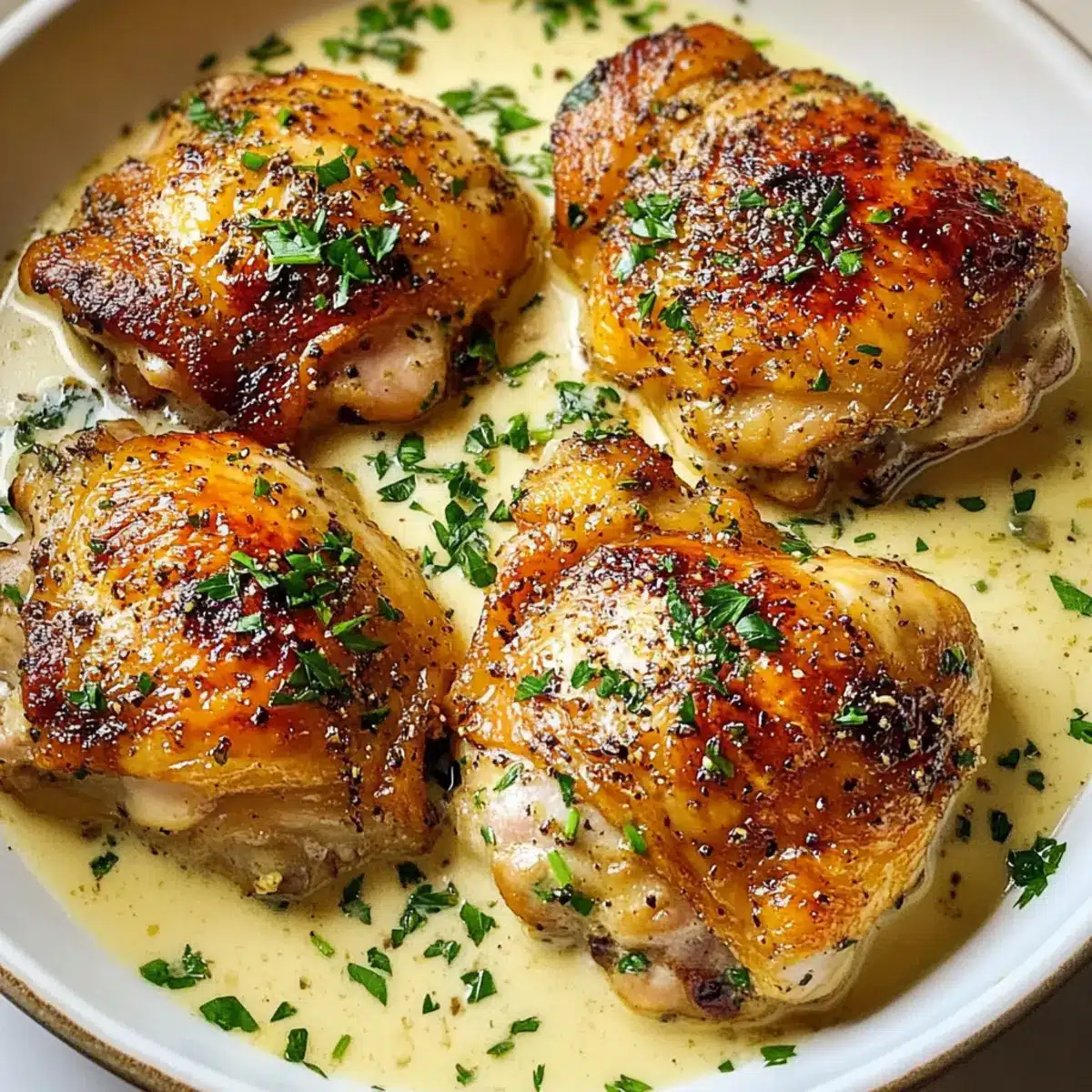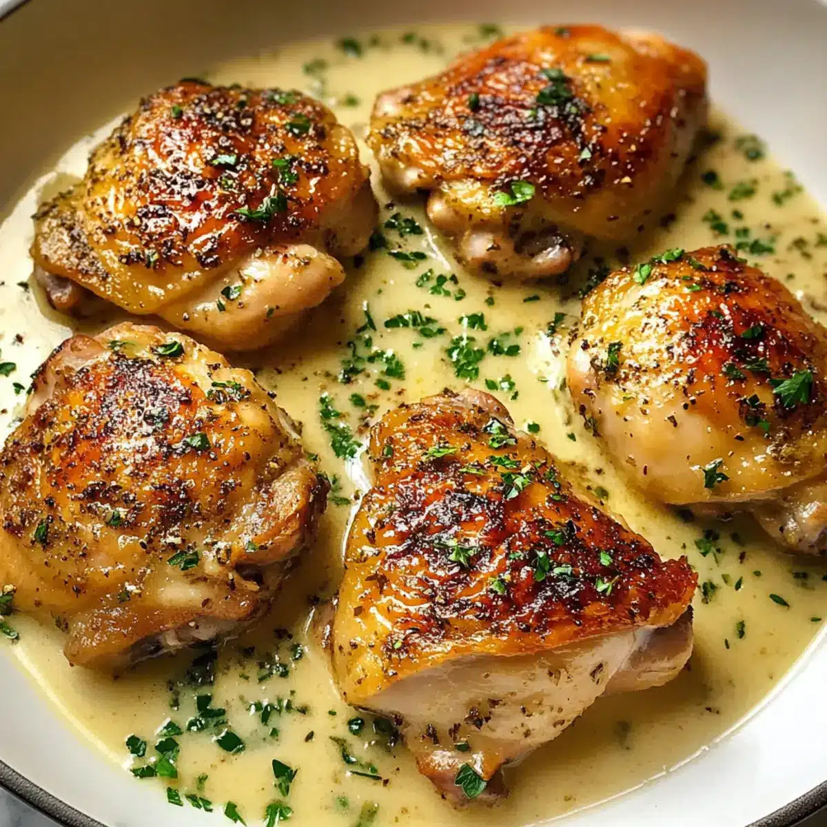- Lege die Hühnchenoberschenkel zurück in die Pfanne und löffle die Sauce großzügig über sie. Garniere mit frisch gehackter Petersilie.