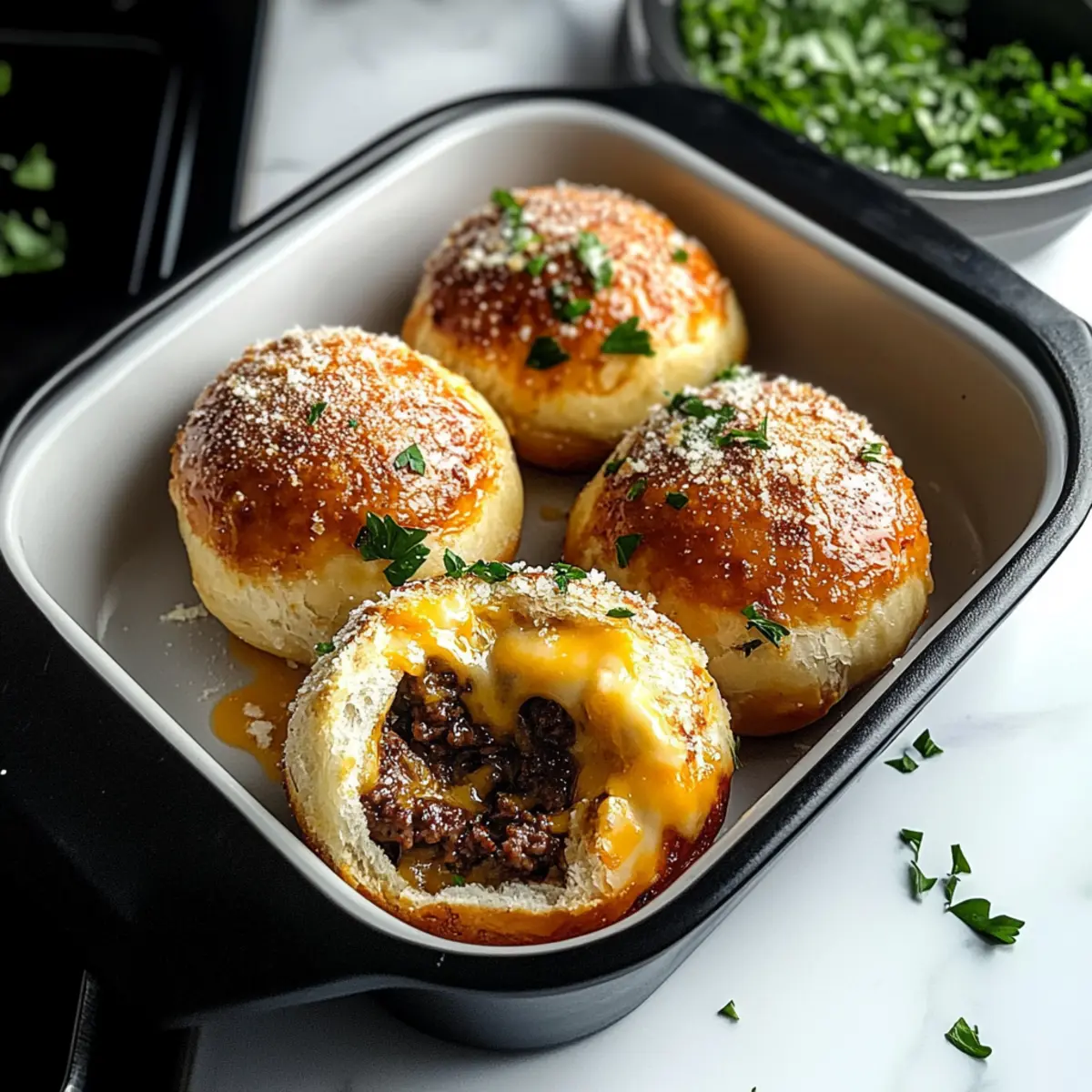 Sobald die Bomben fertig sind, nimm sie aus dem Ofen und lasse sie kurz abkühlen. Garniere sie mit frisch gehackter Petersilie, um einen beliebten Farbtupfer hinzuzufügen. Serviere die Bomben heiß für ein unvergessliches Geschmackserlebnis!