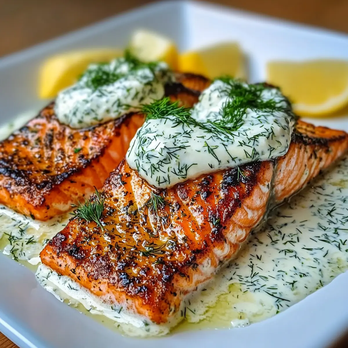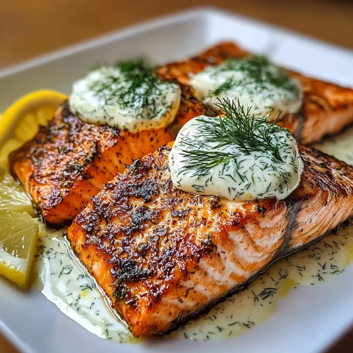 - Richte die knusprigen Lachsfilets auf Tellern an und serviere sie mit der Dill-Joghurt-Sauce.