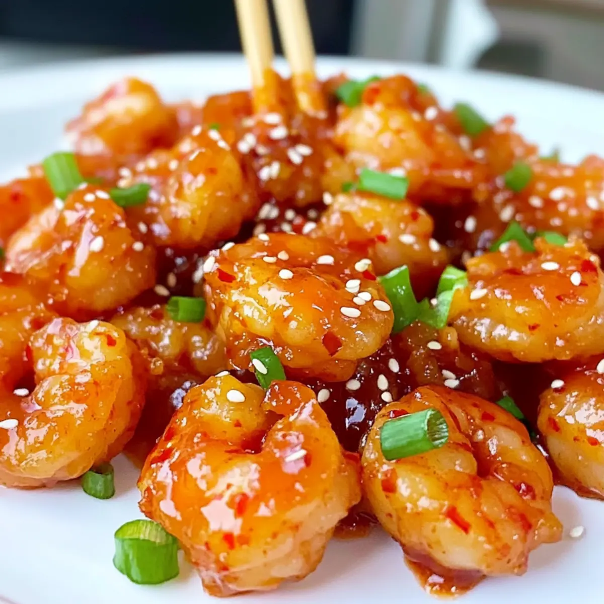 - Die Garnelen auf einem Servierteller anrichten und nach Belieben mit Frühlingszwiebeln und Sesam bestreuen.