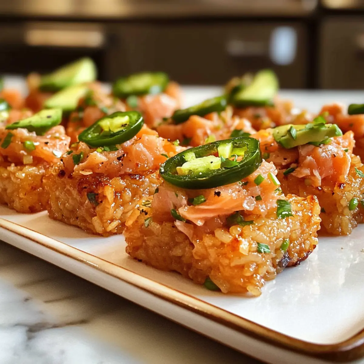 Nehme die knusprigen Reisteile aus der Pfanne und lege sie auf einen Servierteller. Schneide die Avocado in Scheiben und lege einen dünnen Abschnitt auf jedes Stück knusprigen Reis. Toppe die Avocado mit einem großzügigen Löffel der würzigen Lachs-Mischung. Füge nach Belieben frische Jalapeño-Scheiben hinzu, sowie einen Schuss von geröstetem Sesamöl und einen Drizzle Süß-chili-Sauce.