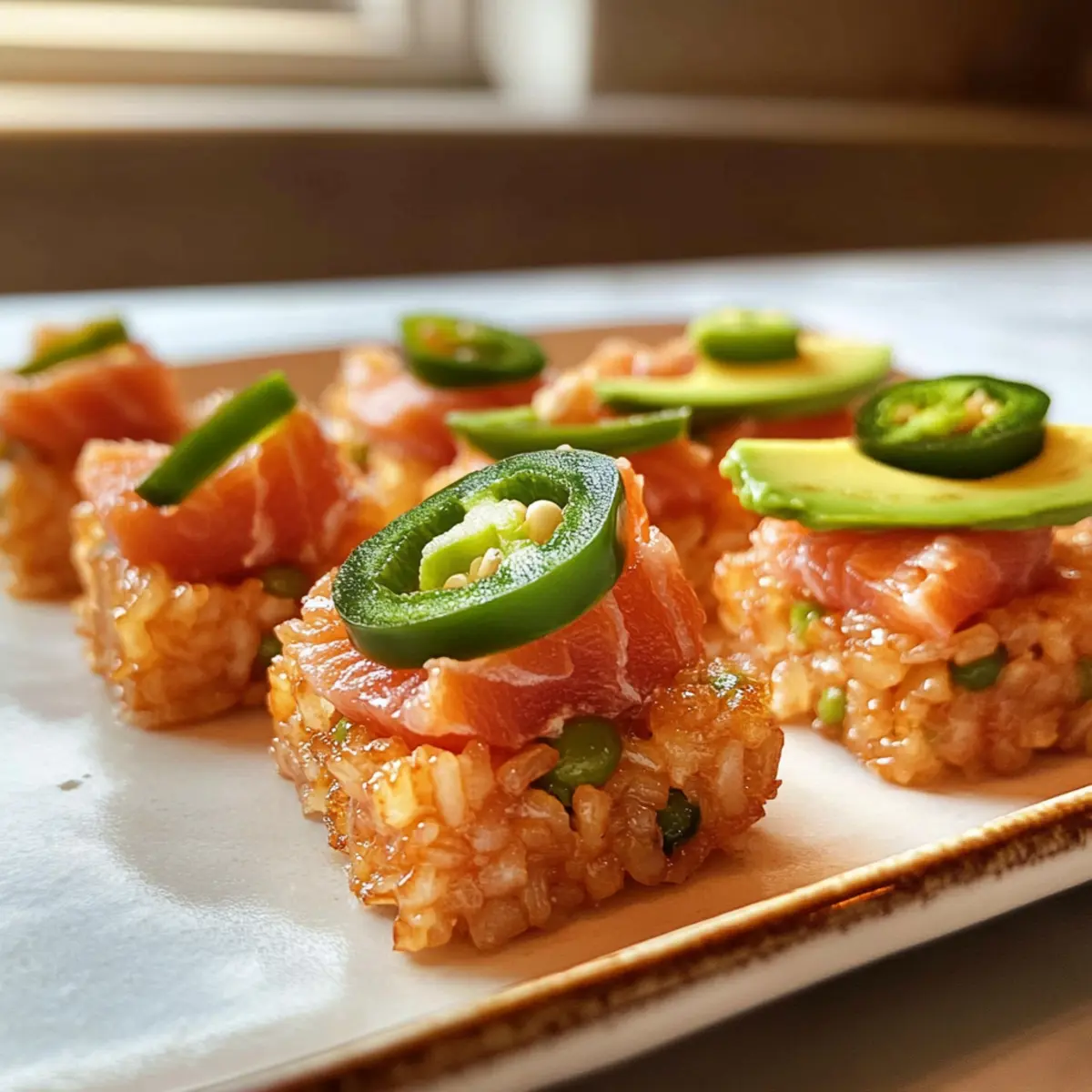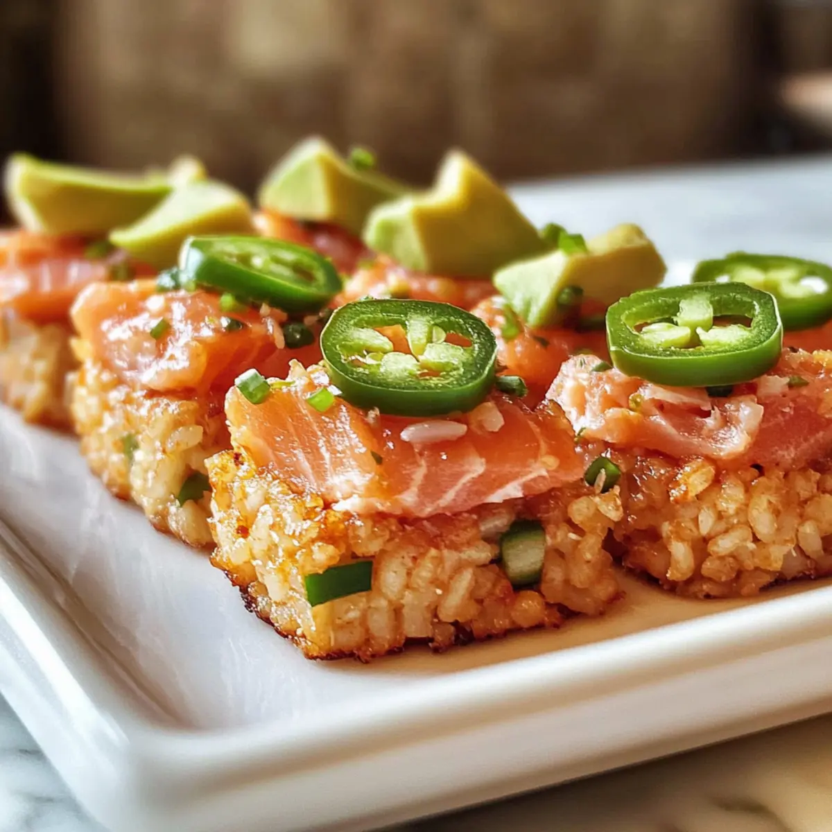 - Richte die Reisstücke an, toppe sie mit der Lachs-Mischung, Avocado und Jalapeño. Serviere sofort.