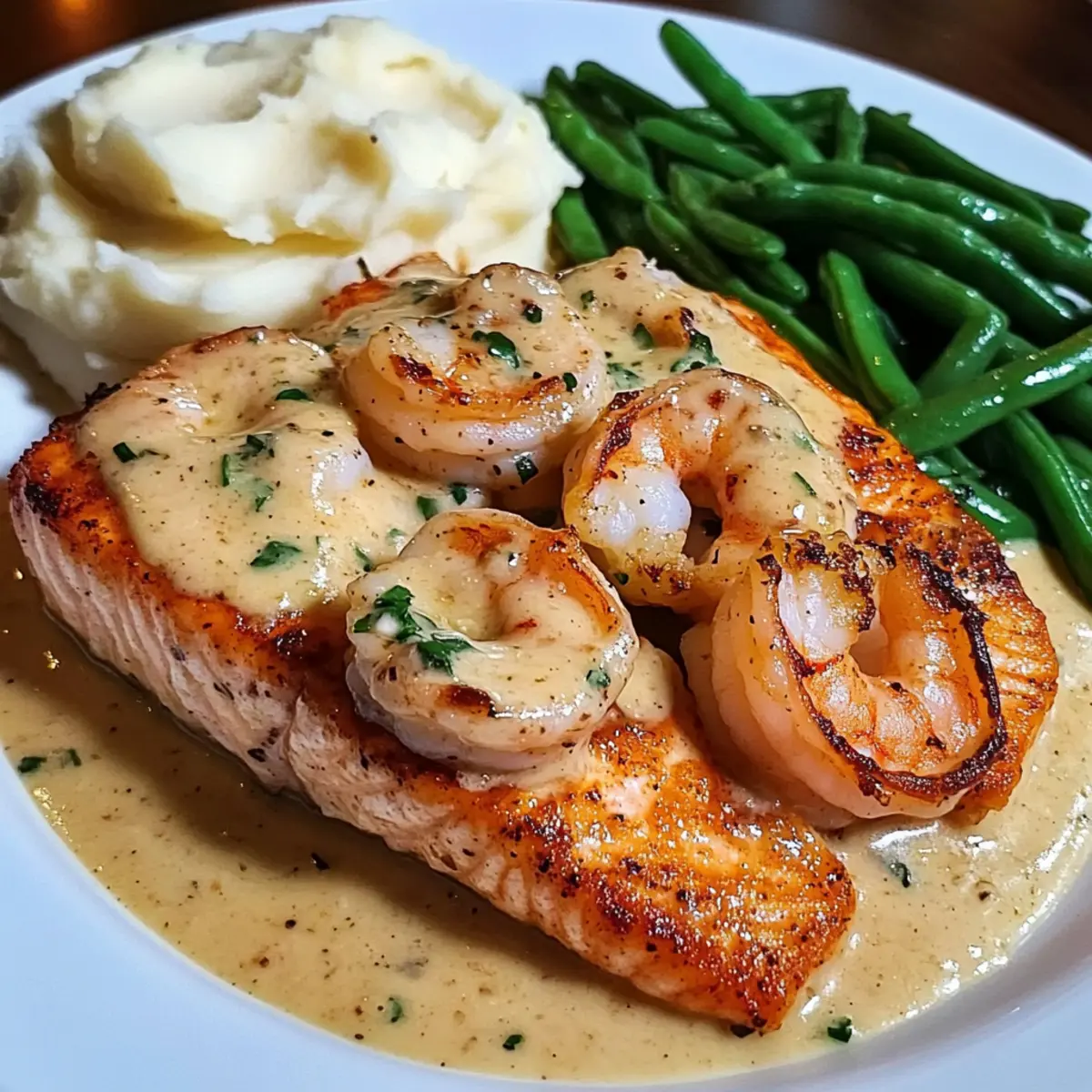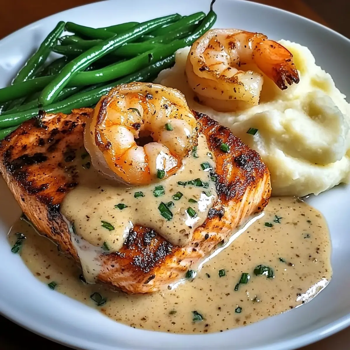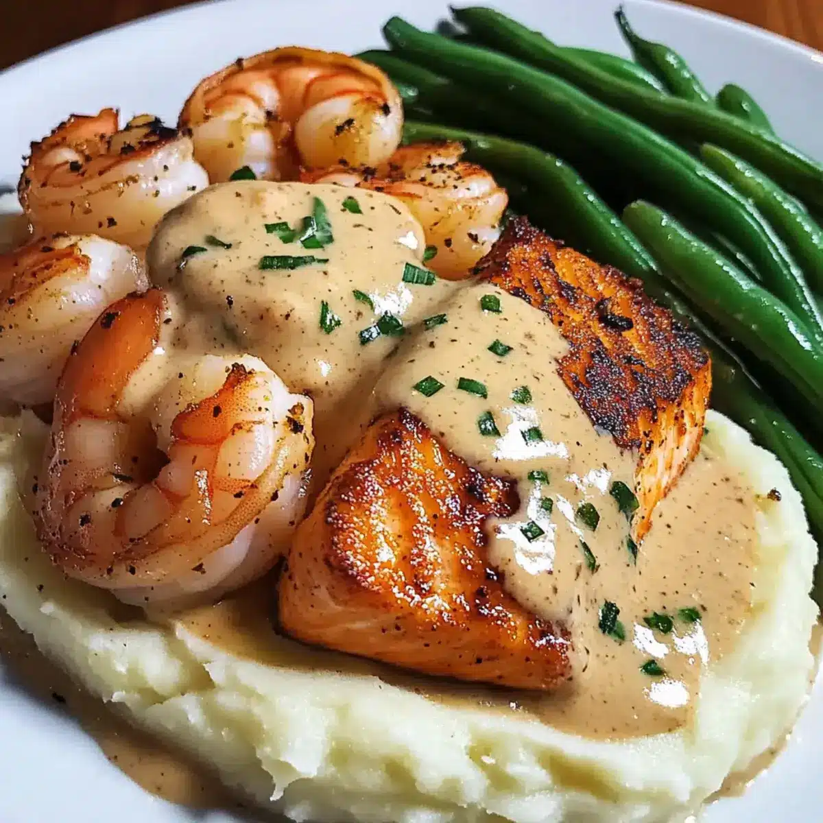 - Das cremige Kartoffelpüree als Basis auf den Tellern verteilen. Die knusprigen grünen Bohnen an die Seite legen und die Garnelen und den Lachs darauf anrichten. Über das gesamte Gericht die vorbereitete Knoblauchsauce großzügig gießen und sofort servieren.