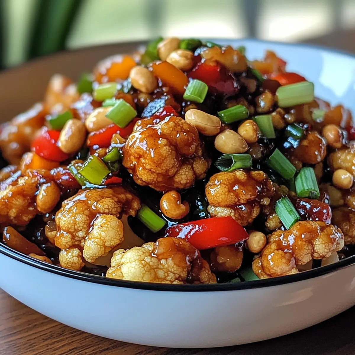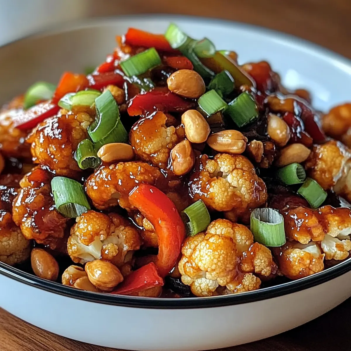 Garnieren den Kung Pao Blumenkohl mit geschnittenen Frühlingszwiebeln und serviere ihn heiß über Reis oder Nudeln. Alternativ kann das Gericht auch alleine genossen werden und bietet eine köstliche, pflanzliche Option für jeden Anlass.